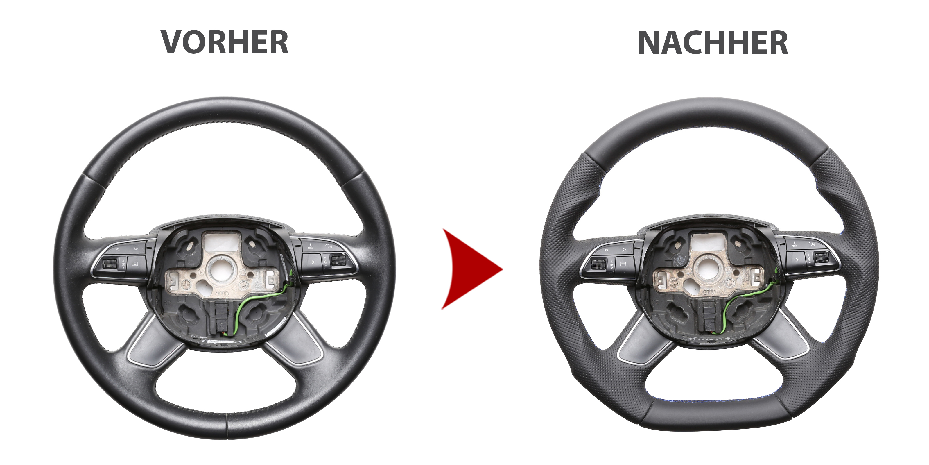 Der Austausch erfolgt ausschließlich gegen ein baugleiches Lenkradmodell. Alle Anbauteile wie Airbag, Multifunktionstasten, Blenden, Schaltwippen oder gar ein Spurhalteassistent übernehmen Sie problemlos von Ihrem Lenkrad. Diese sind nicht im Lieferumfang enthalten.