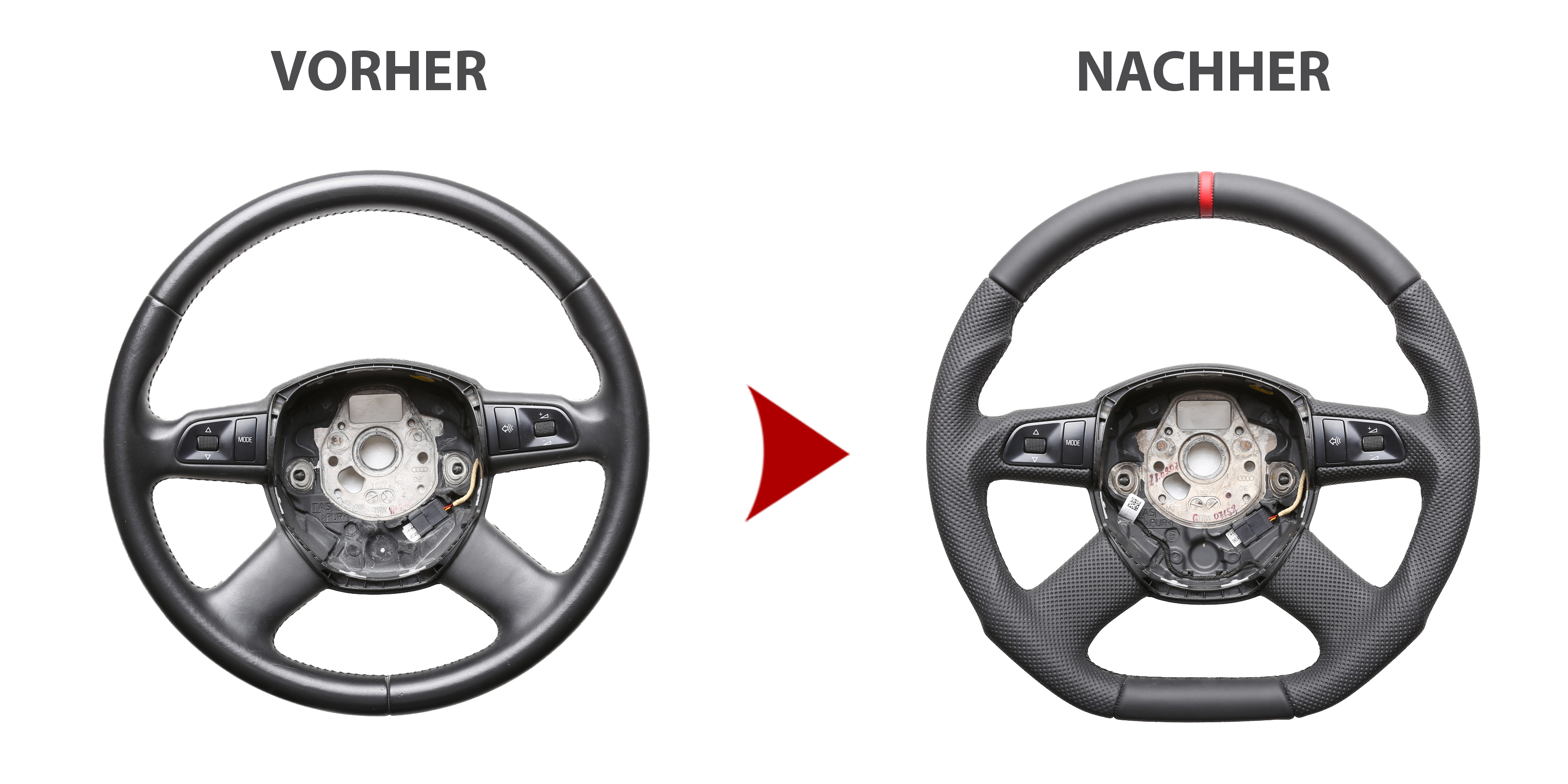 Produktinformationen "Audi Lenkrad A3 A4 A6 A8 Q5 Q7 Abgeflacht MFL 12Uhr Markierung rot Kombiebzug Naht schwarz"
