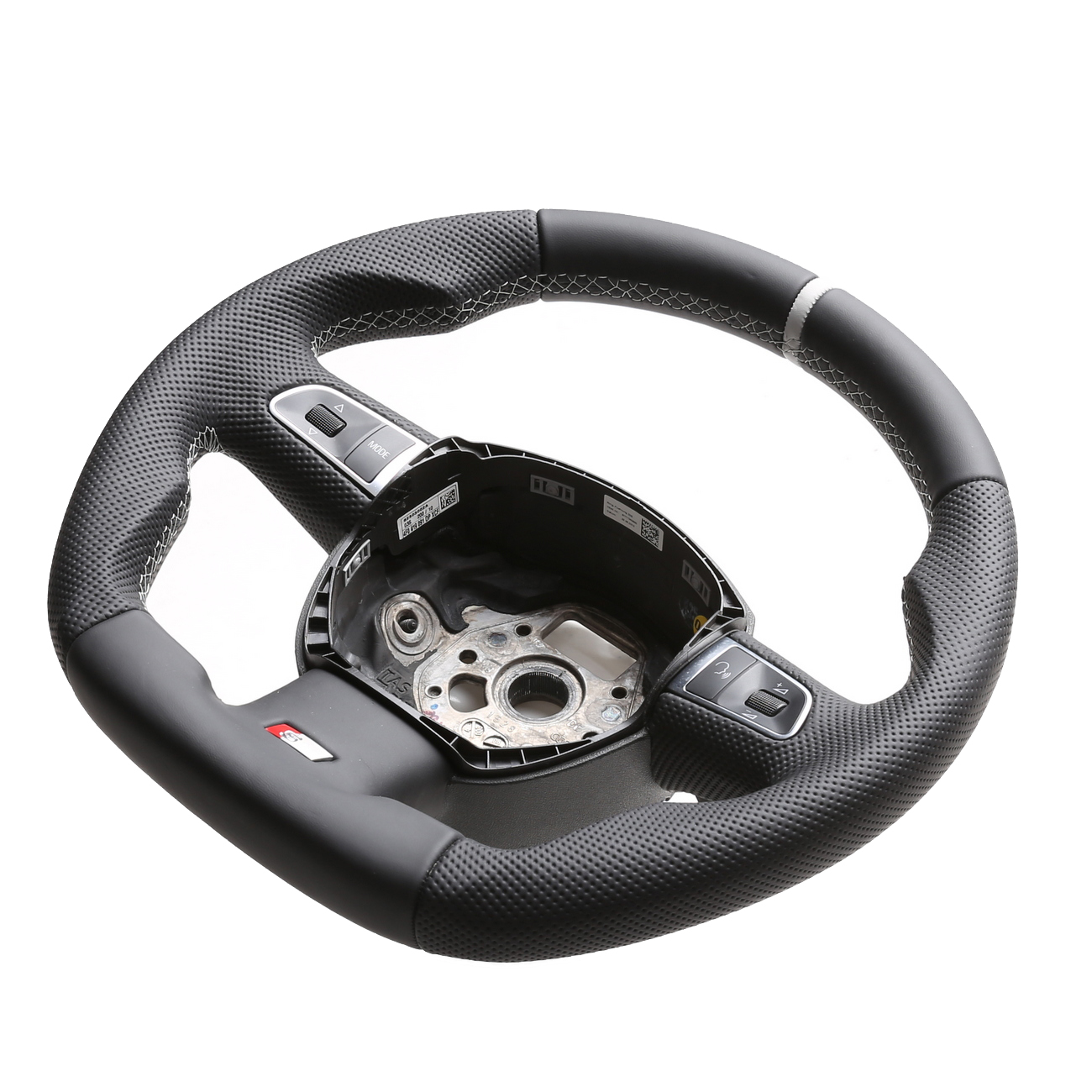 Originalfarbe schwarz, ein Kombibezug aus Audi Nappa und perforiertem Leder, 12 Uhr Markierung silber, Naht silber