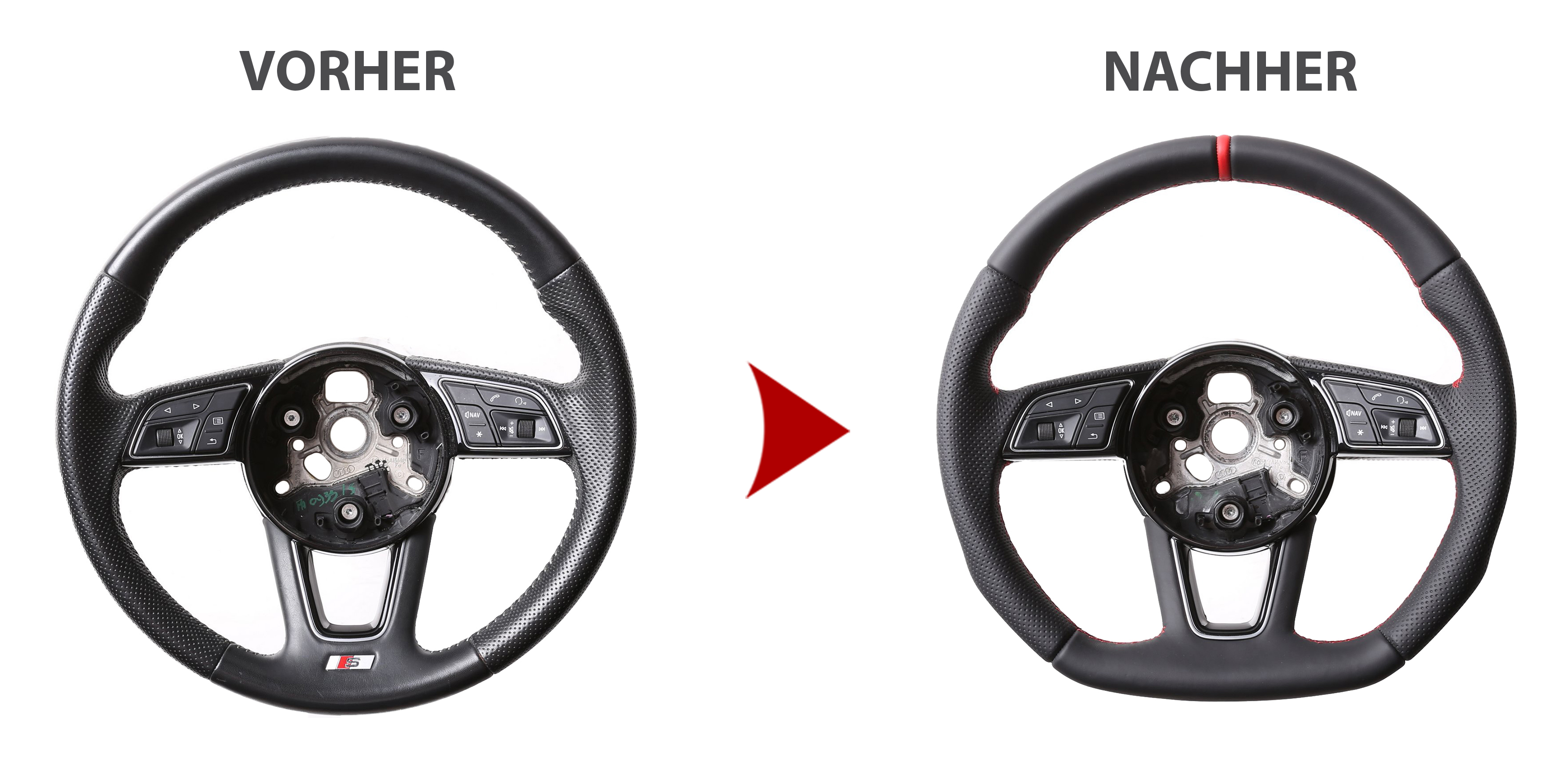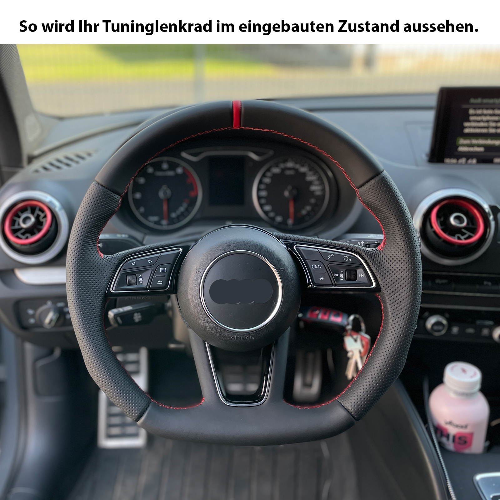 Produktinformationen "Audi Lenkrad A4 A1 S1 A3 A6 S6 A7 A8 Q3 Abgeflacht Kombibezug 12 Uhr Markierung rot Naht rot"