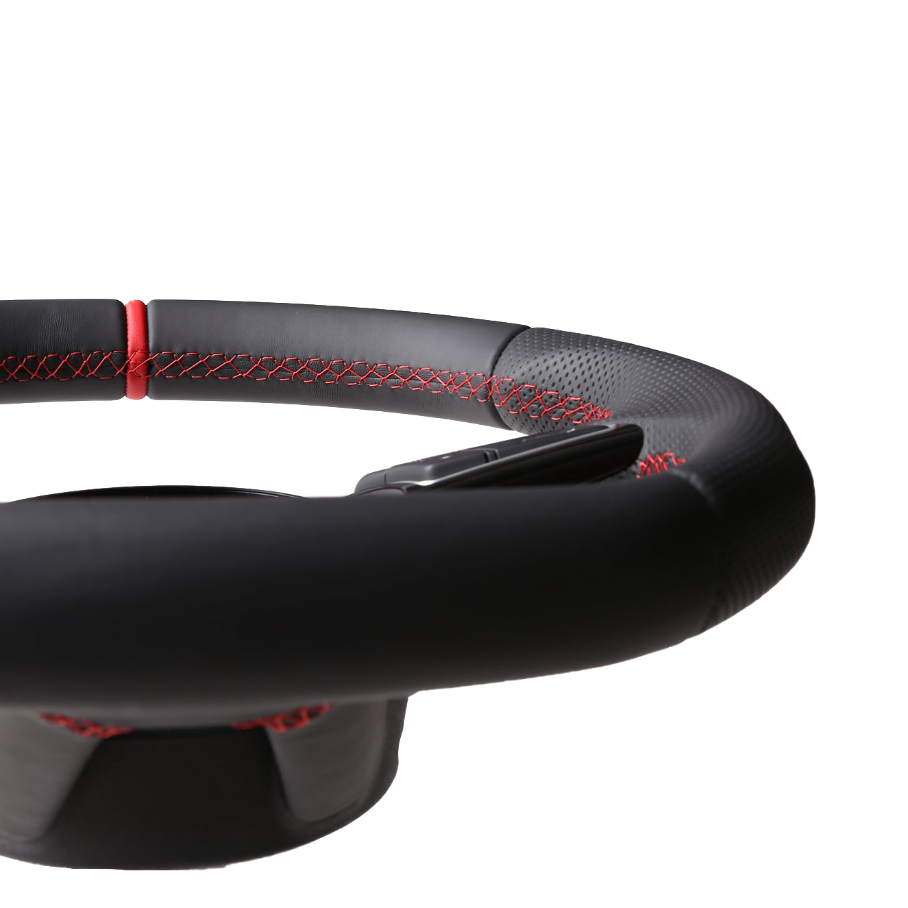 Abgeflachtes Lenkrad mit ergonomischen Griffen für maximale Kontrolle. Abgeflacht wie von Werk