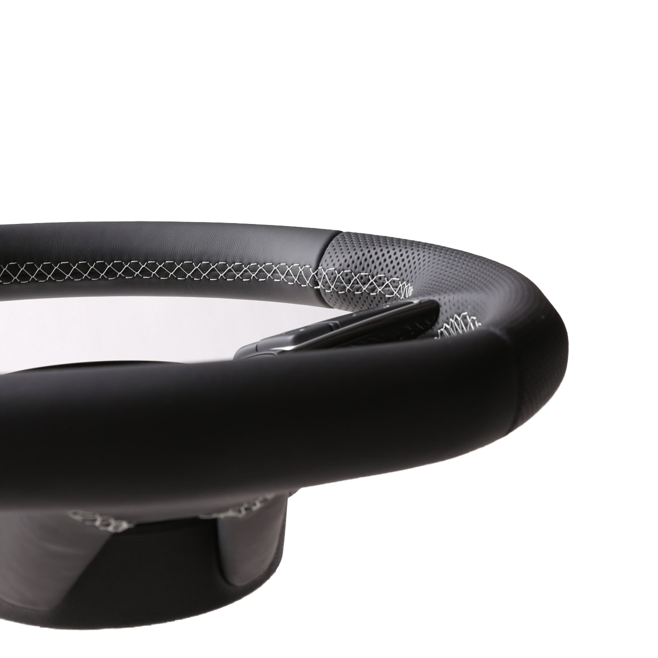 Abgeflachtes Lenkrad mit ergonomischen Griffen für maximale Kontrolle. Abgeflacht wie von Werk