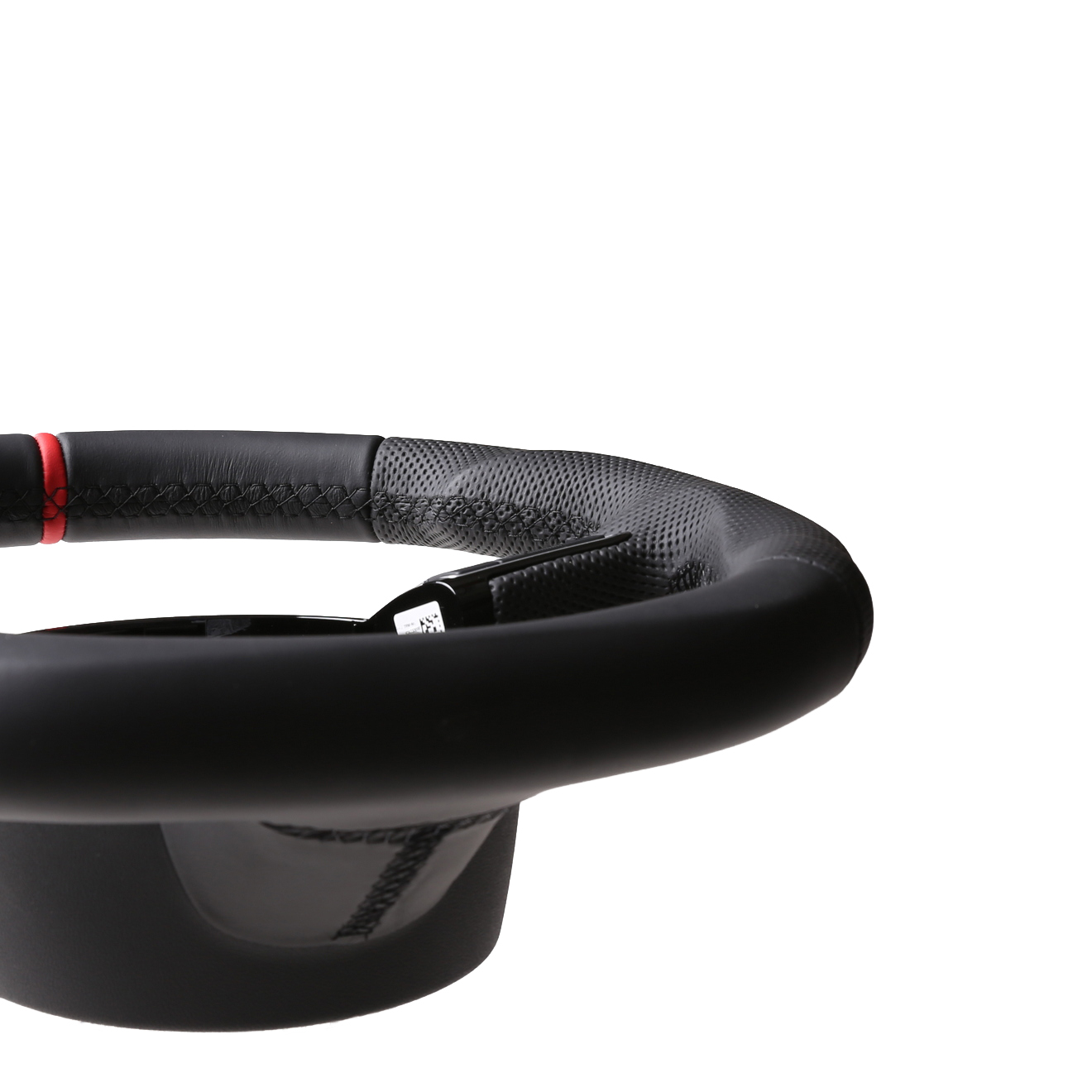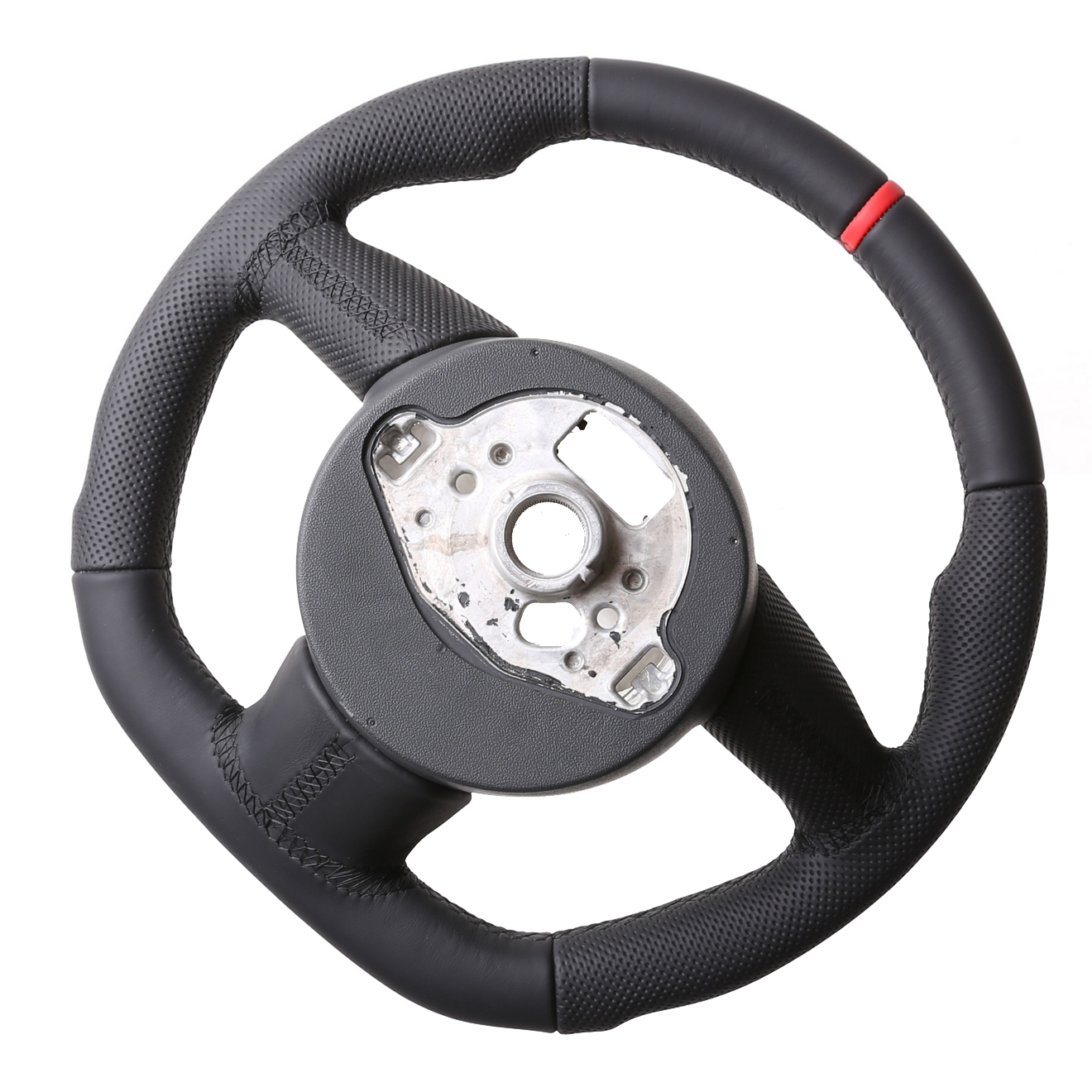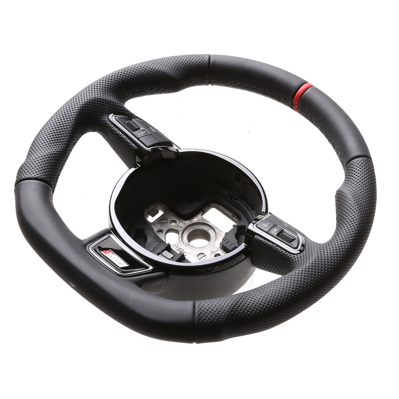 Originalfarbe schwarz, ein Kombibezug aus Audi Nappa und perforiertem Leder, 12 Uhr Markierung rot, Naht schwarz