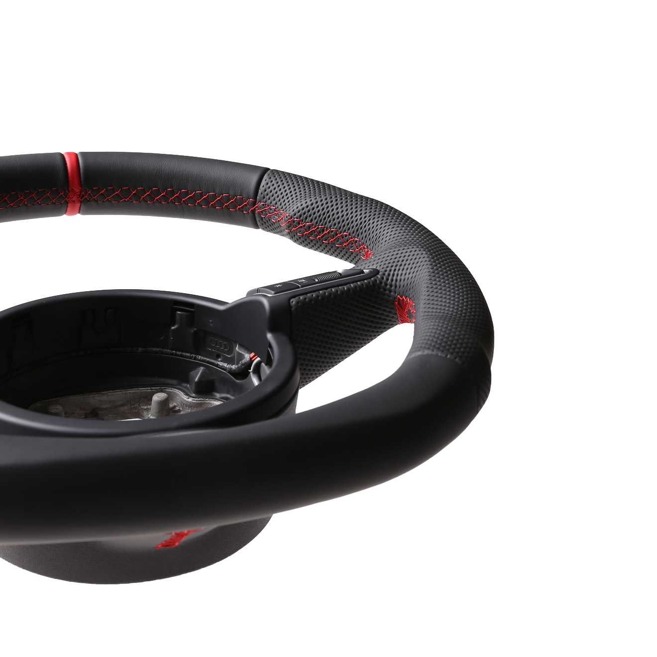 Originalfarbe schwarz, ein Kombibezug aus Audi Nappa und schwarzem perforiertem Leder, 12 Uhr Markierung rot, Naht rot