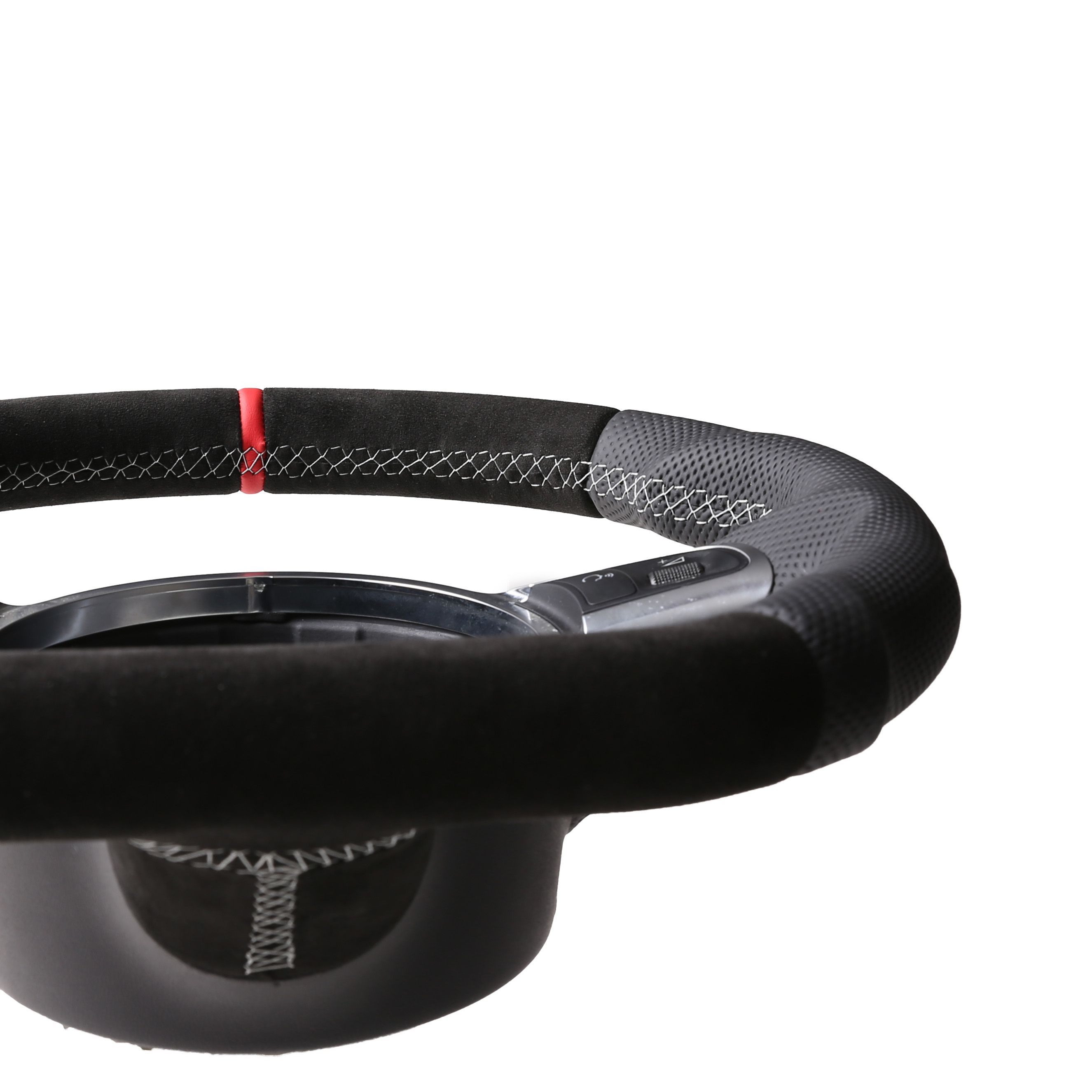 Originalfarbe schwarz, ein Kombibezug aus Alcantara und perforiertem Leder, 12 Uhr Markierung rot, Naht silber
