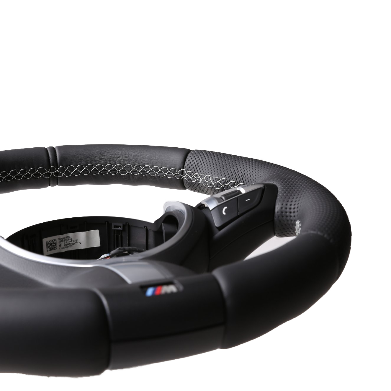Originalfarbe schwarz, ein Kombibezug aus BMW Nappa und perforiertem Leder, 12 Uhr Markierung silber, Naht silber