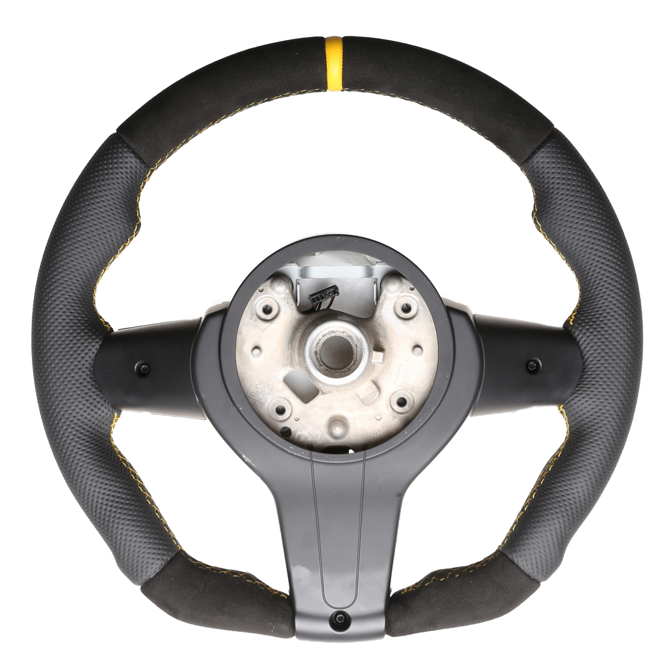 Originalfarbe schwarz, ein Kombibezug aus Alcantara und perforiertem Leder, 12 Uhr Markierung gelb, Naht gelb