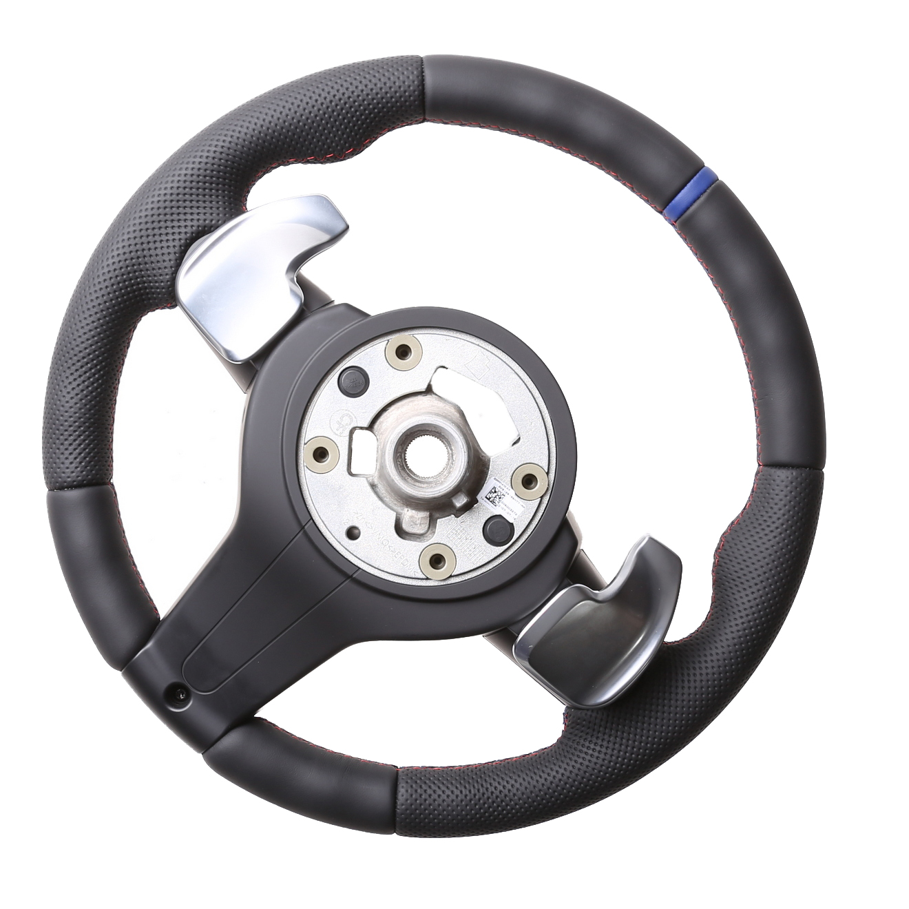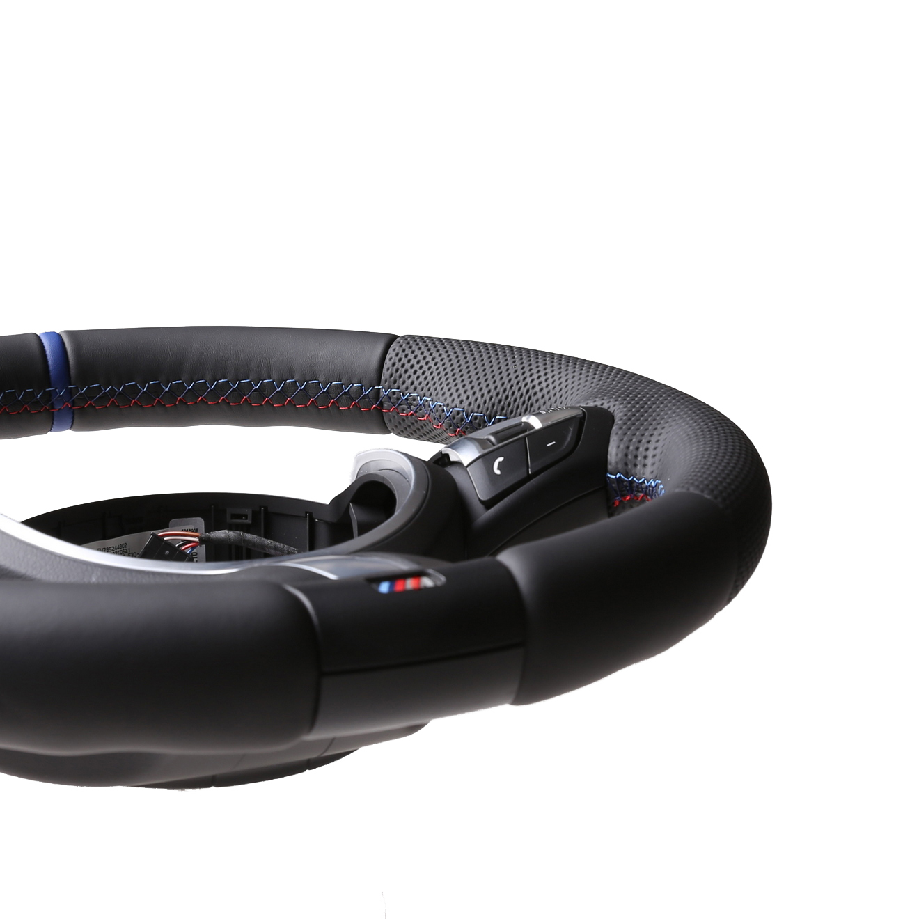Originalfarbe schwarz, ein Kombibezug aus BMW Nappa und perforiertem Leder, 12 Uhr Markierung blau, BMW M-Naht