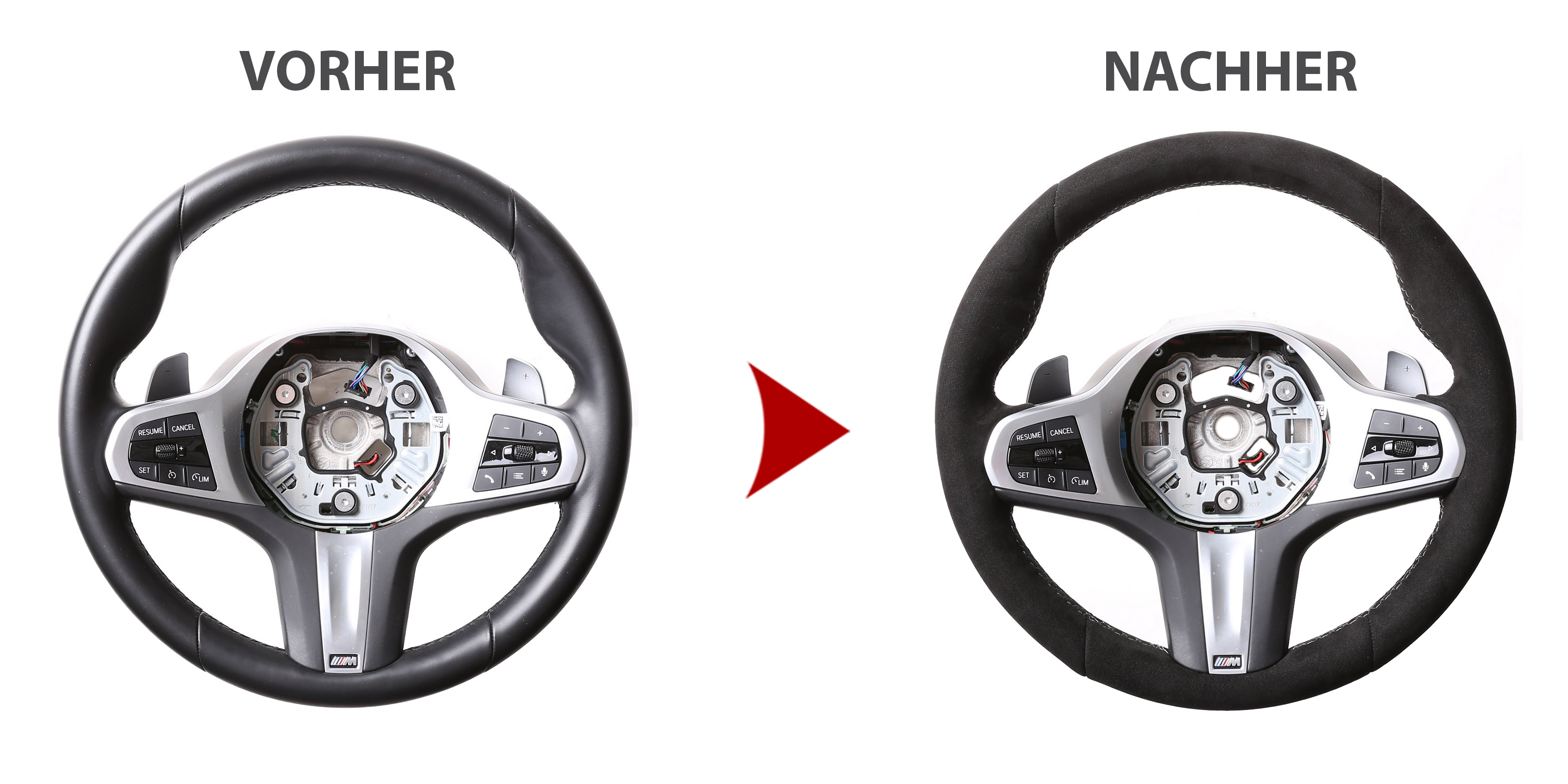 Des Weiteren bieten wir auch den Neubezug Ihres Lenkrades nach Ihren individuellen Vorstellungen bei uns vor Ort an. Sollte es Ihr Lenkradmodell ausnahmsweise nicht in unserem Sortiment geben, dann können wir Ihnen Ihr Lenkrad ausbauen, innerhalb von 4-5 Stunden den Wunschbezug anfertigen und anschließend können Sie wieder nach fachgerechtem Einbau durch uns ohne lange Versandwartezeiten und teure Werkstattbesuche mit Ihrem neu bezogenen Lederlenkrad nach Hause fahren!
