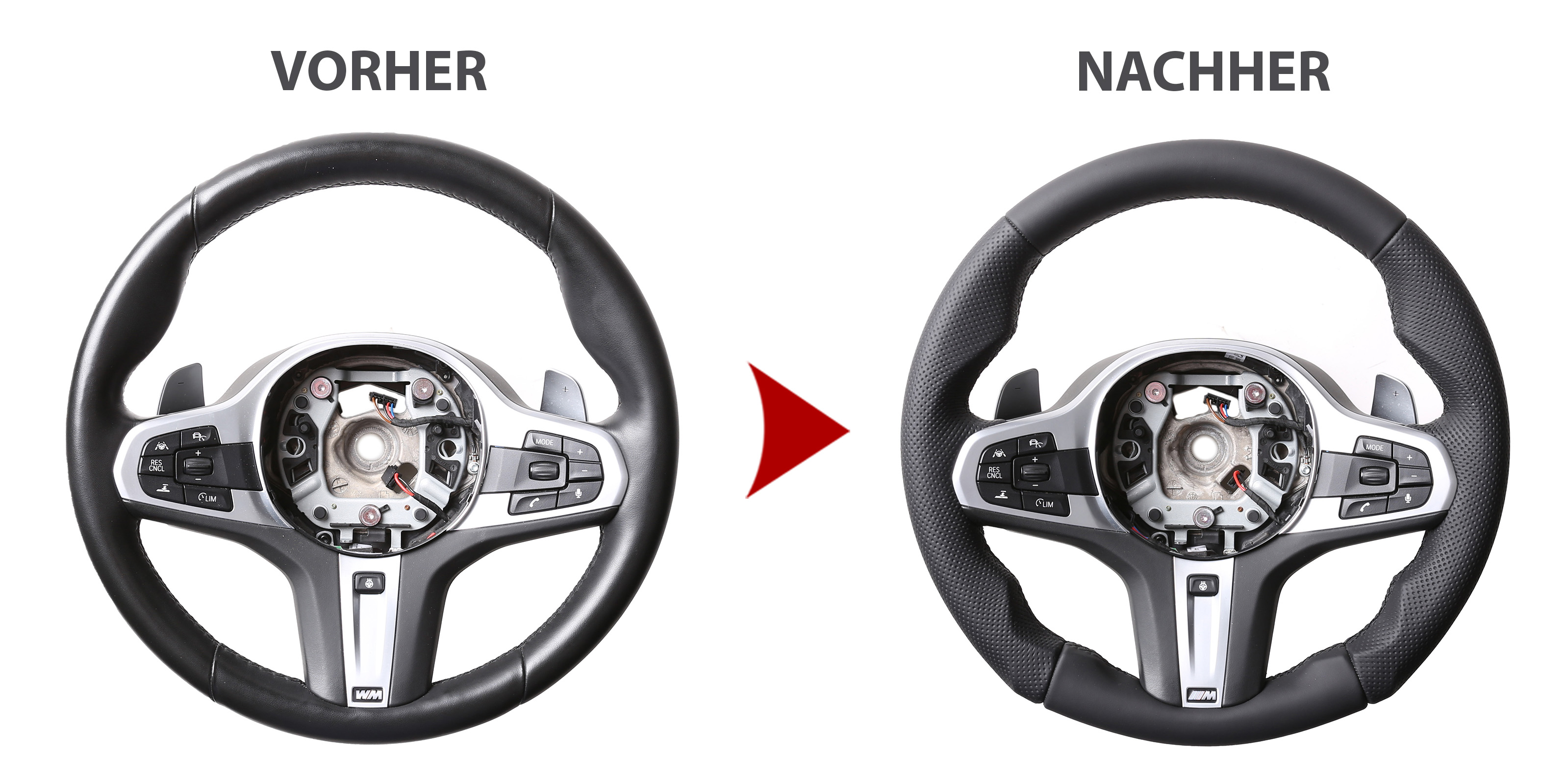 Des Weiteren bieten wir auch den Neubezug Ihres Lenkrades nach Ihren individuellen Vorstellungen bei uns vor Ort an. Sollte es Ihr Lenkradmodell ausnahmsweise nicht in unserem Sortiment geben, dann können wir Ihnen Ihr Lenkrad ausbauen, innerhalb von 4-5 Stunden den Wunschbezug anfertigen und anschließend können Sie wieder nach fachgerechtem Einbau durch uns ohne lange Versandwartezeiten und teure Werkstattbesuche mit Ihrem neu bezogenen Lederlenkrad nach Hause fahren!