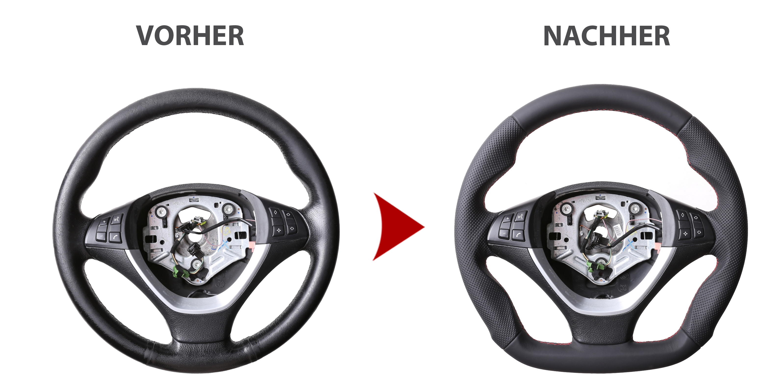 Des Weiteren bieten wir auch den Neubezug Ihres Lenkrades nach Ihren individuellen Vorstellungen bei uns vor Ort an. Sollte es Ihr Lenkradmodell ausnahmsweise nicht in unserem Sortiment geben, dann können wir Ihnen Ihr Lenkrad ausbauen, innerhalb von 4-5 Stunden den Wunschbezug anfertigen und anschließend können Sie wieder nach fachgerechtem Einbau durch uns ohne lange Versandwartezeiten und teure Werkstattbesuche mit Ihrem neu bezogenen Lederlenkrad nach Hause fahren!