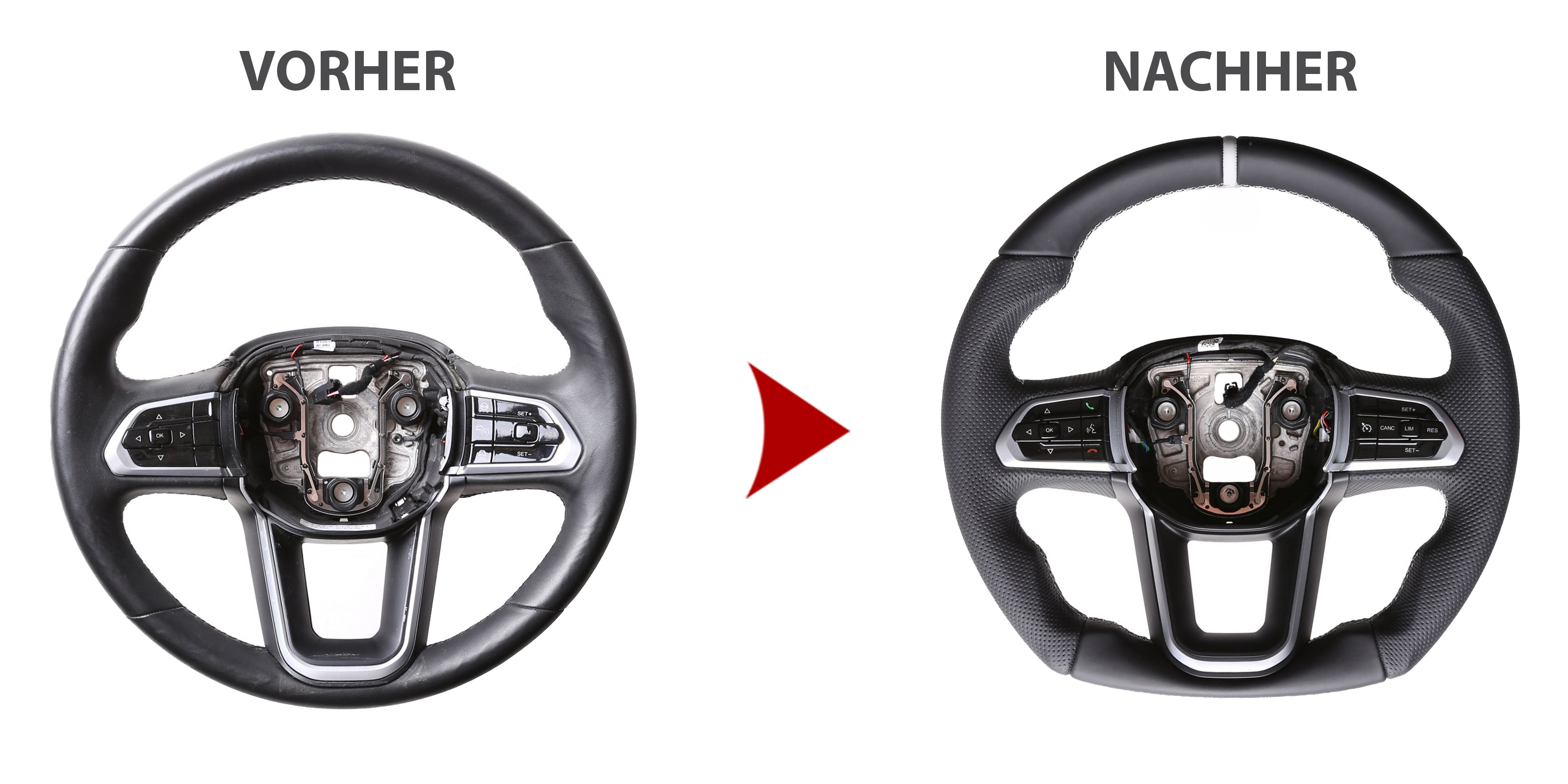 Der Austausch erfolgt ausschließlich gegen ein baugleiches Lenkradmodell. Alle Anbauteile wie Airbag, Multifunktionstasten, Blenden, Schaltwippen oder gar ein Spurhalteassistent übernehmen Sie problemlos von Ihrem Lenkrad. Diese sind nicht im Lieferumfang enthalten.