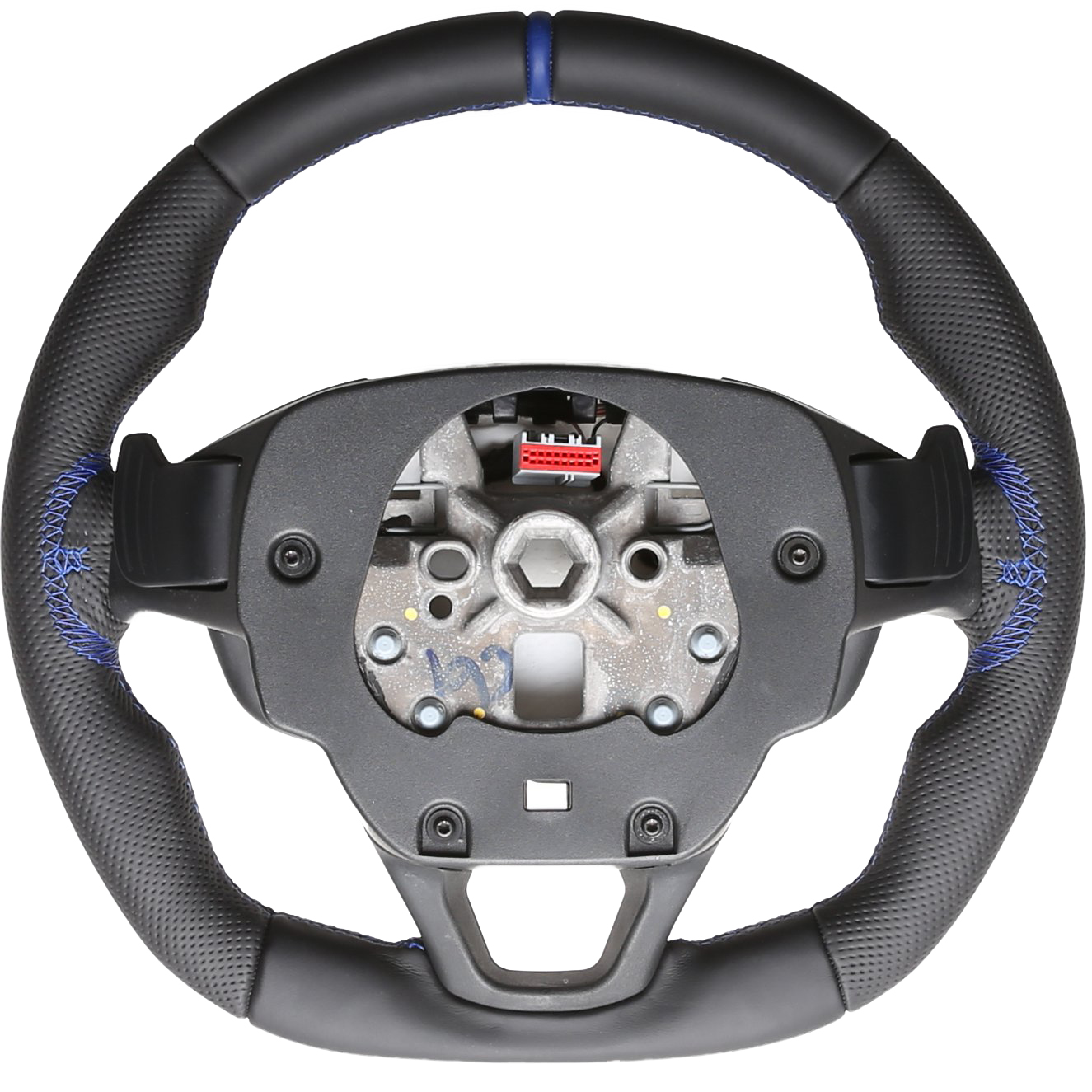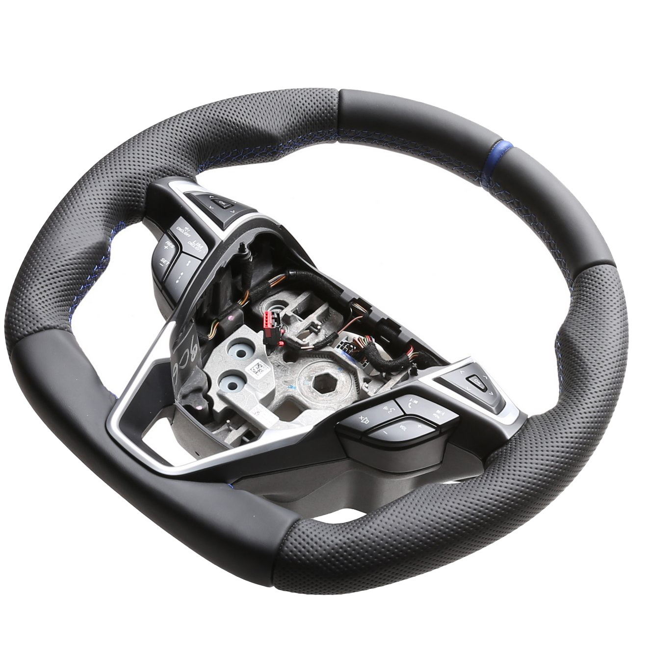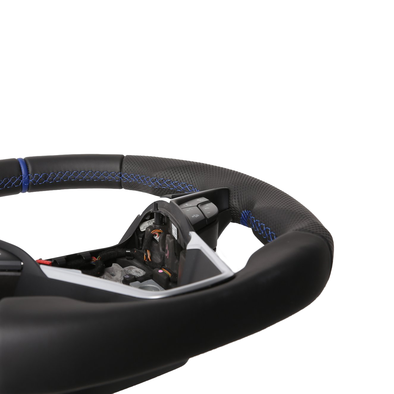 Originalfarbe schwarz, ein Kombibezug aus Nappa und perforiertem Leder, 12 Uhr Markierung blau, Naht blau
