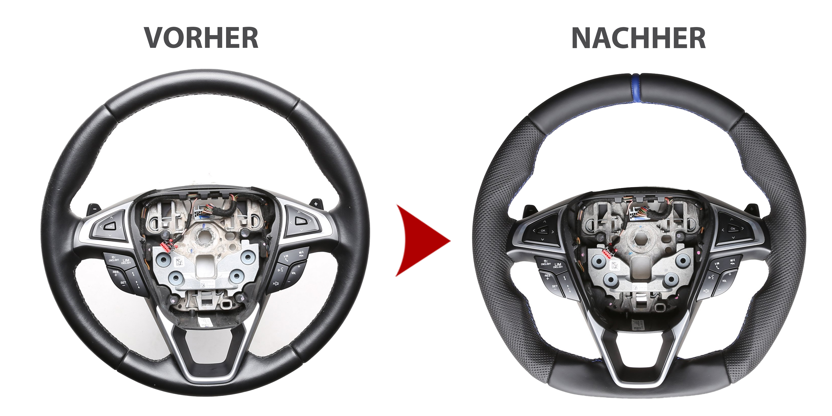 Der Austausch erfolgt ausschließlich gegen ein baugleiches Lenkradmodell. Alle Anbauteile wie Airbag, Multifunktionstasten, Blenden, Schaltwippen oder gar ein Spurhalteassistent übernehmen Sie problemlos von Ihrem Lenkrad. Diese sind nicht im Lieferumfang enthalten.