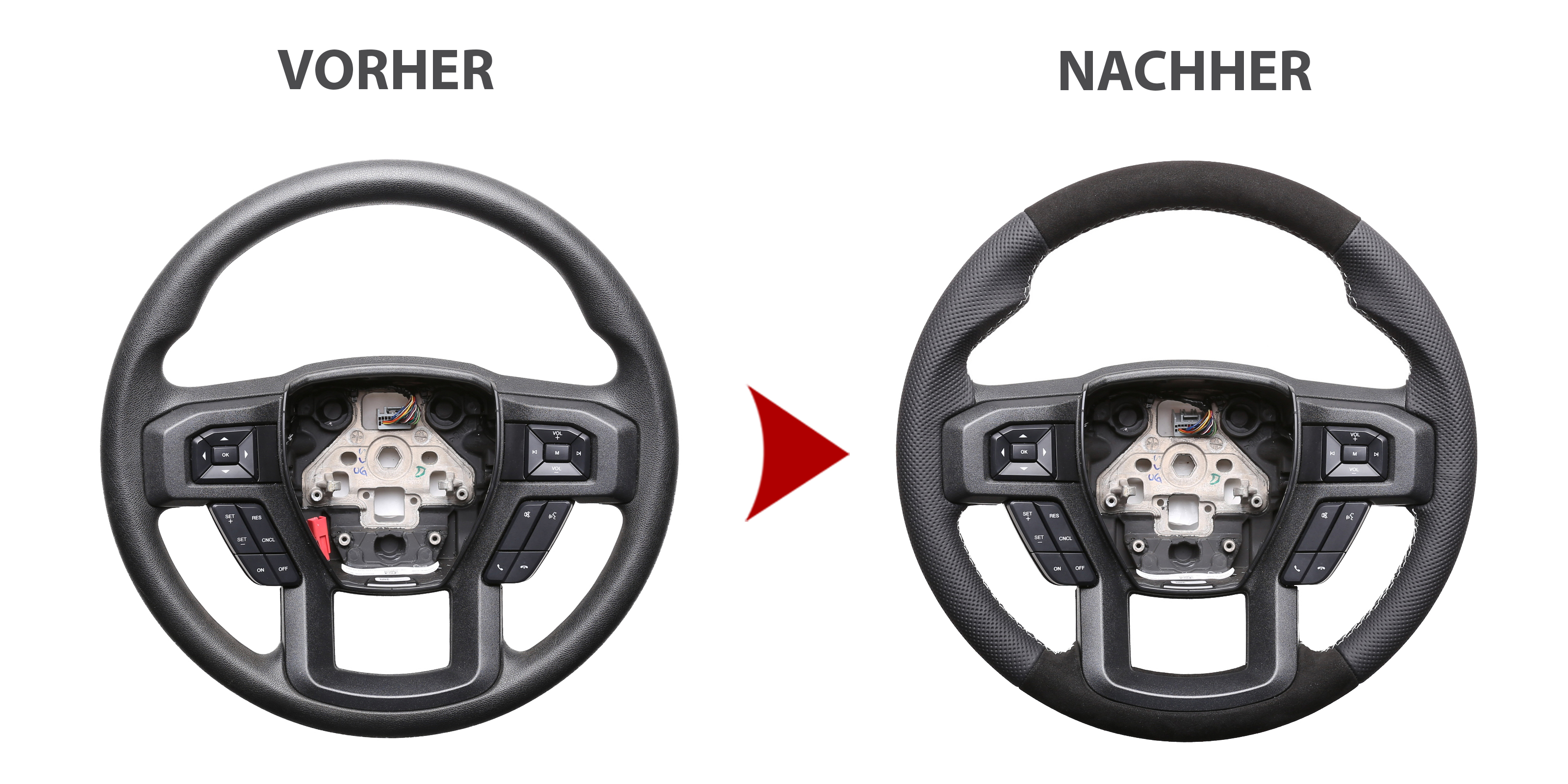 Der Austausch erfolgt ausschließlich gegen ein baugleiches Lenkradmodell. Alle Anbauteile wie Airbag, Multifunktionstasten, Blenden, Schaltwippen oder gar ein Spurhalteassistent übernehmen Sie problemlos von Ihrem Lenkrad. Diese sind nicht im Lieferumfang enthalten
