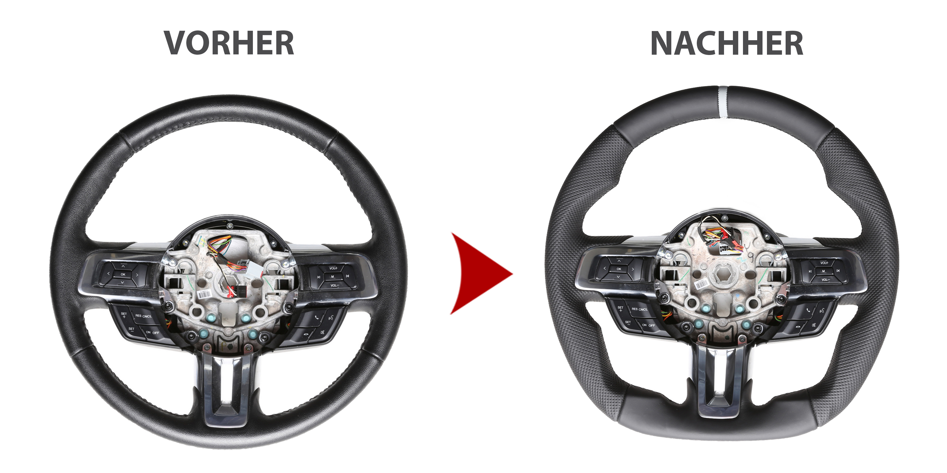 Der Austausch erfolgt ausschließlich gegen ein baugleiches Lenkradmodell. Alle Anbauteile wie Airbag, Multifunktionstasten, Blenden, Schaltwippen oder gar ein Spurhalteassistent übernehmen Sie problemlos von Ihrem Lenkrad. Diese sind nicht im Lieferumfang enthalten