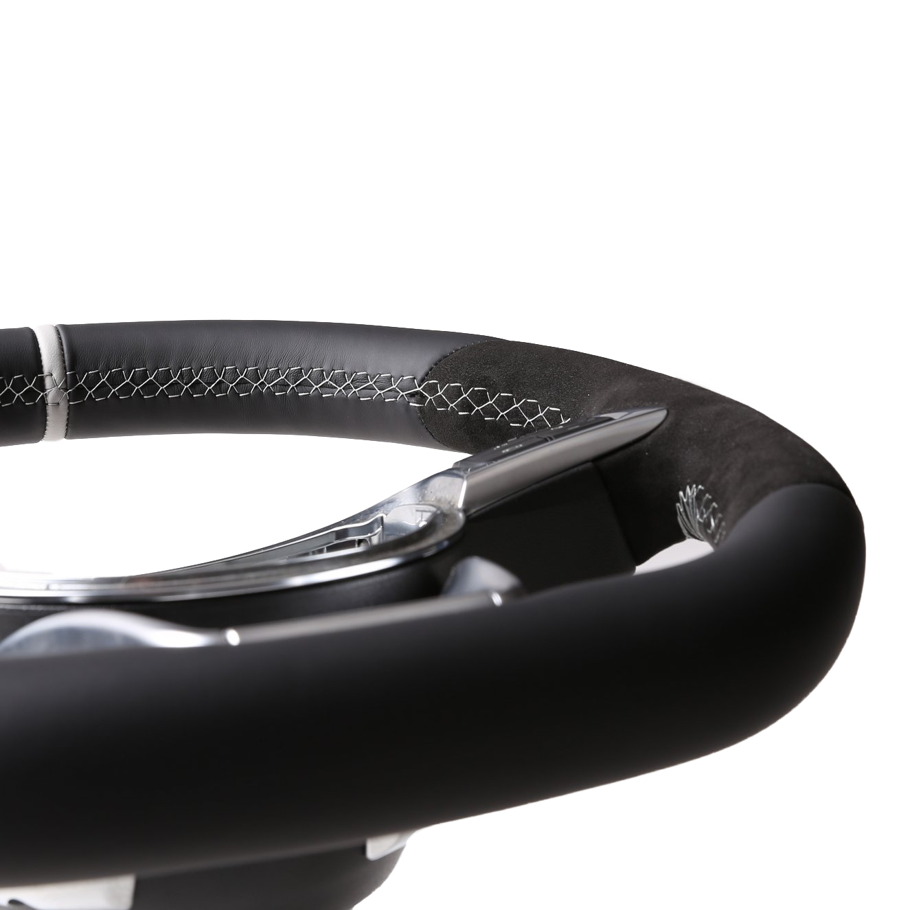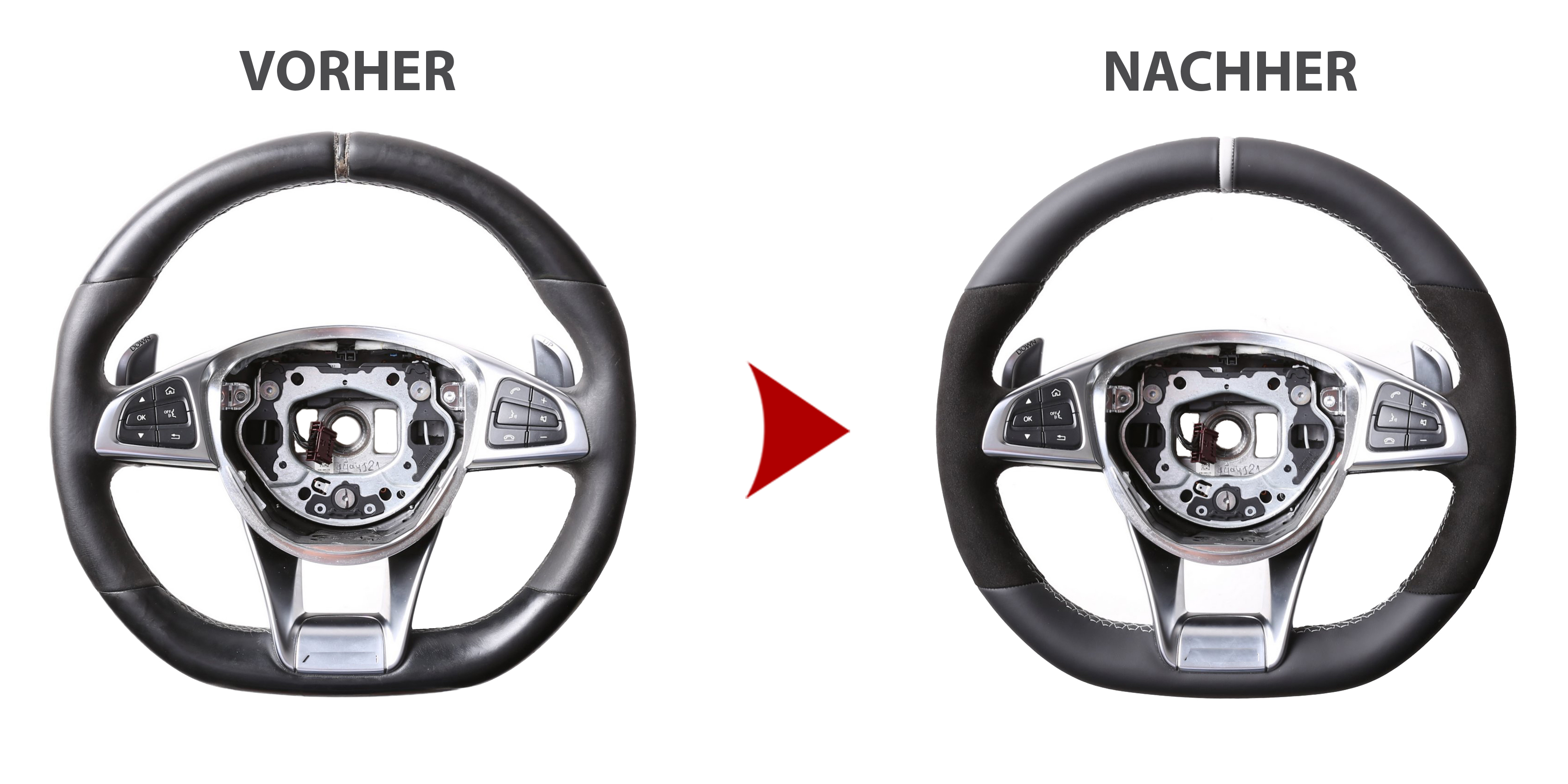 Originalfarbe schwarz, ein Kombibezug aus Mercedes Nappa und Alcantara Leder, 12 Uhr Markierung silber, Naht silber