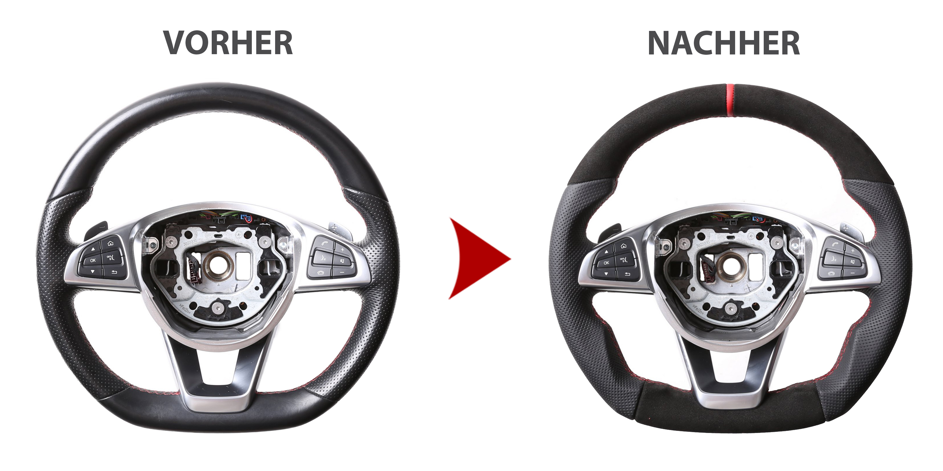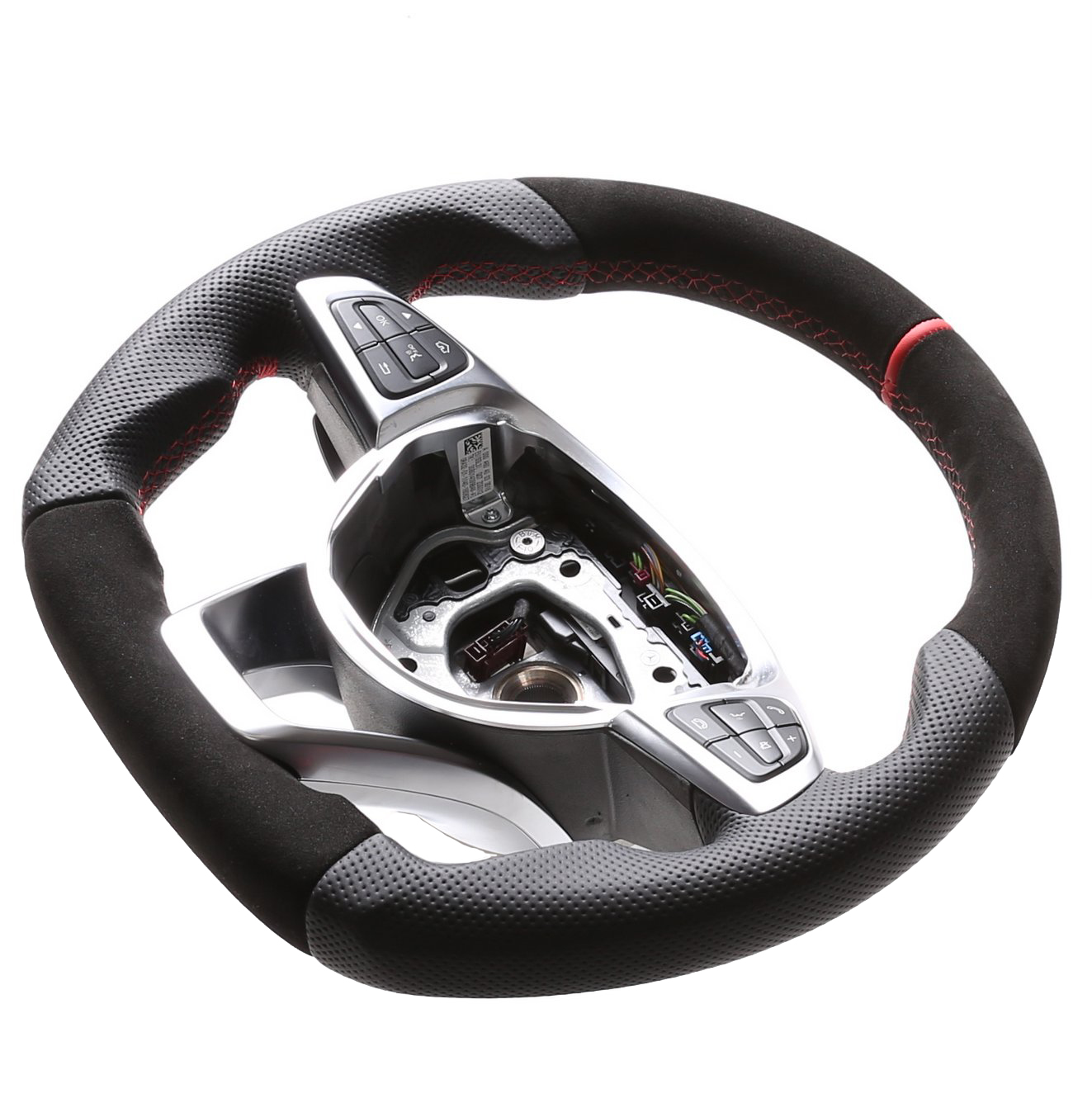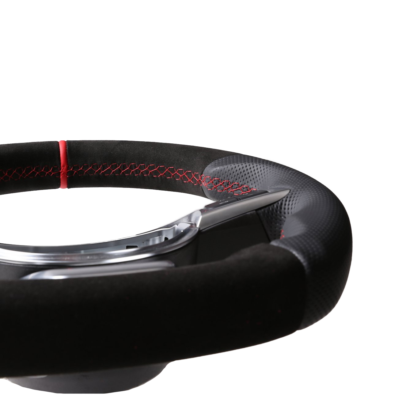 Originalfarbe schwarz, ein Kombibezug aus Alcantara und perforiertem Leder, 12 Uhr Markierung rot, Naht rot. Horizontale Trennnähte im oberen Bereich