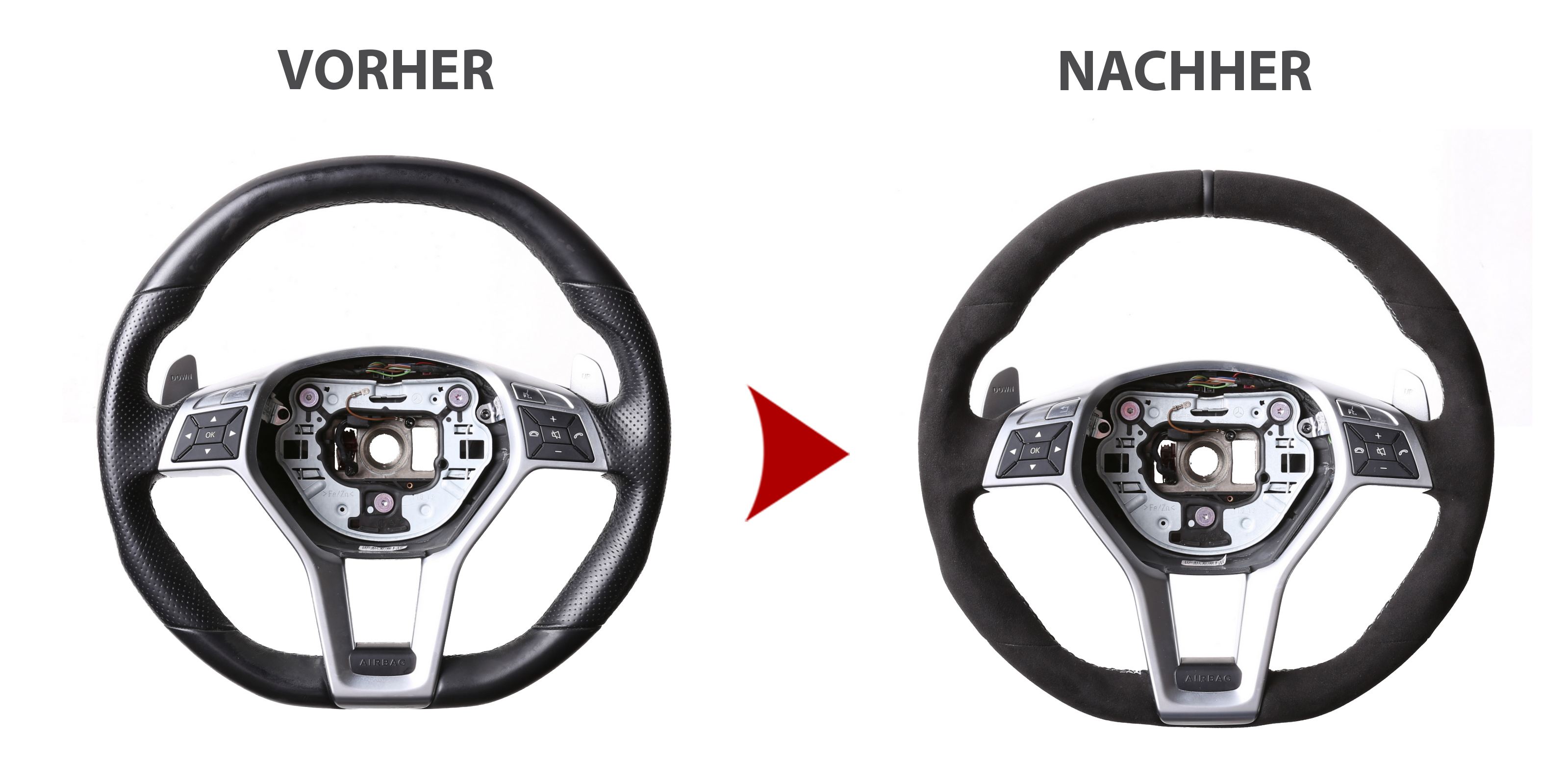 Originalfarbe schwarz, ein Bezug aus Alcantara Leder, 12 Uhr Markierung, Naht silber