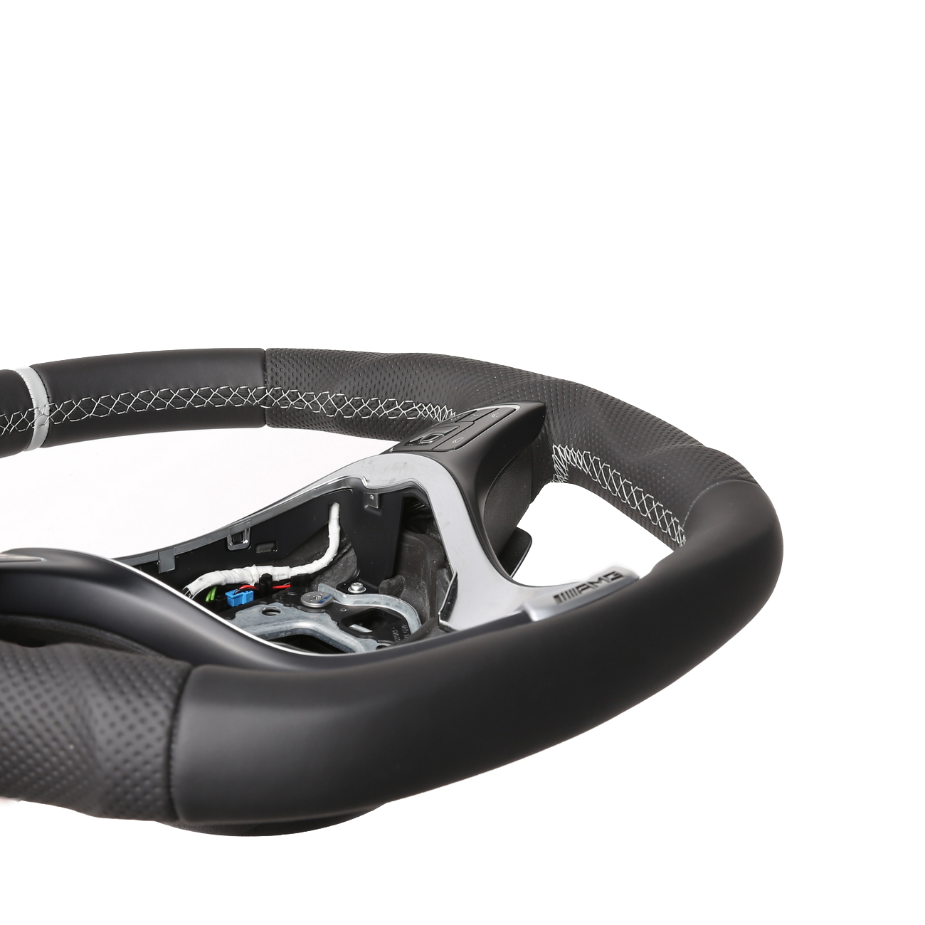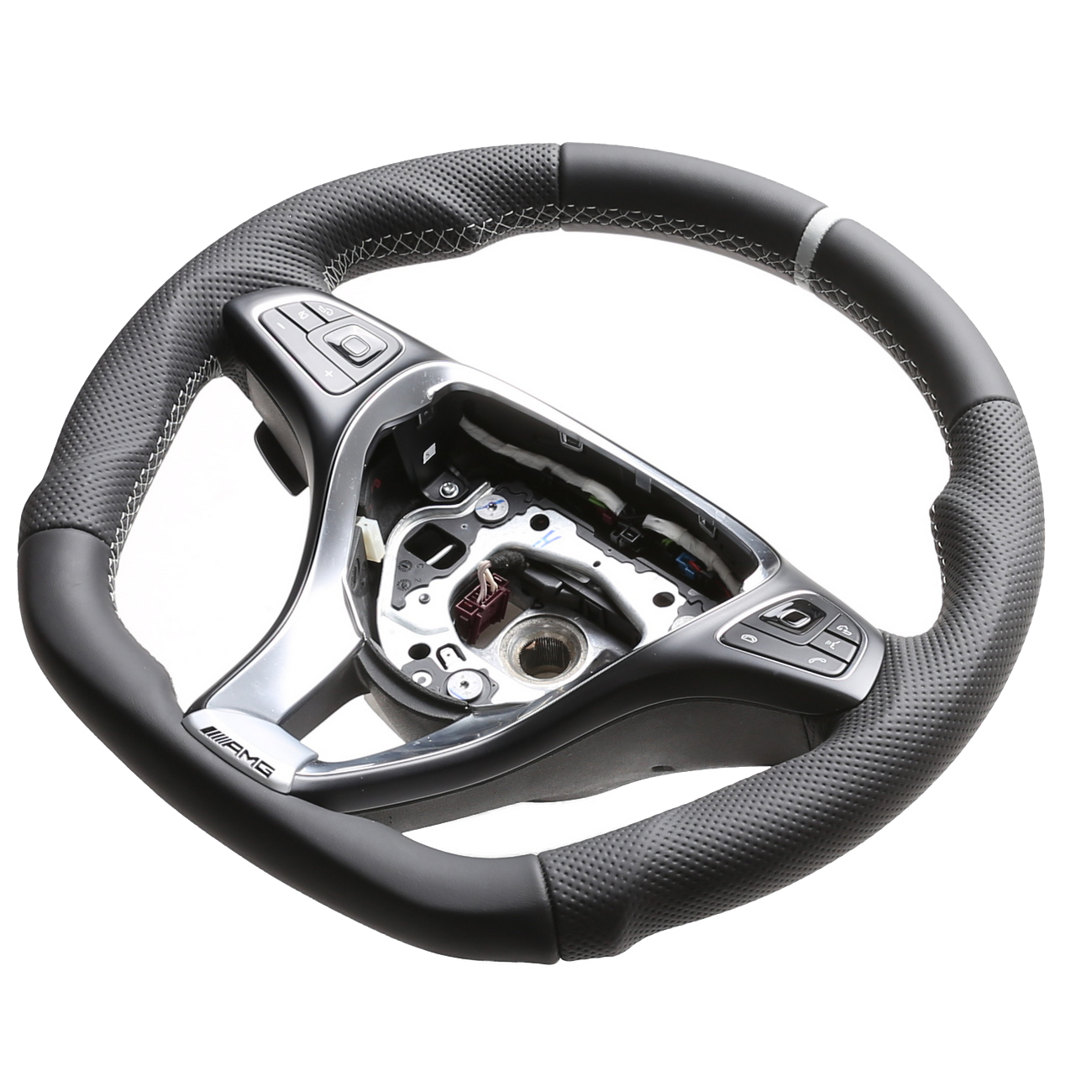 Originalfarbe schwarz, ein Kombibezug aus Mercedes Nappa und perforiertem Leder, 12 Uhr Markierung silber, Naht silber