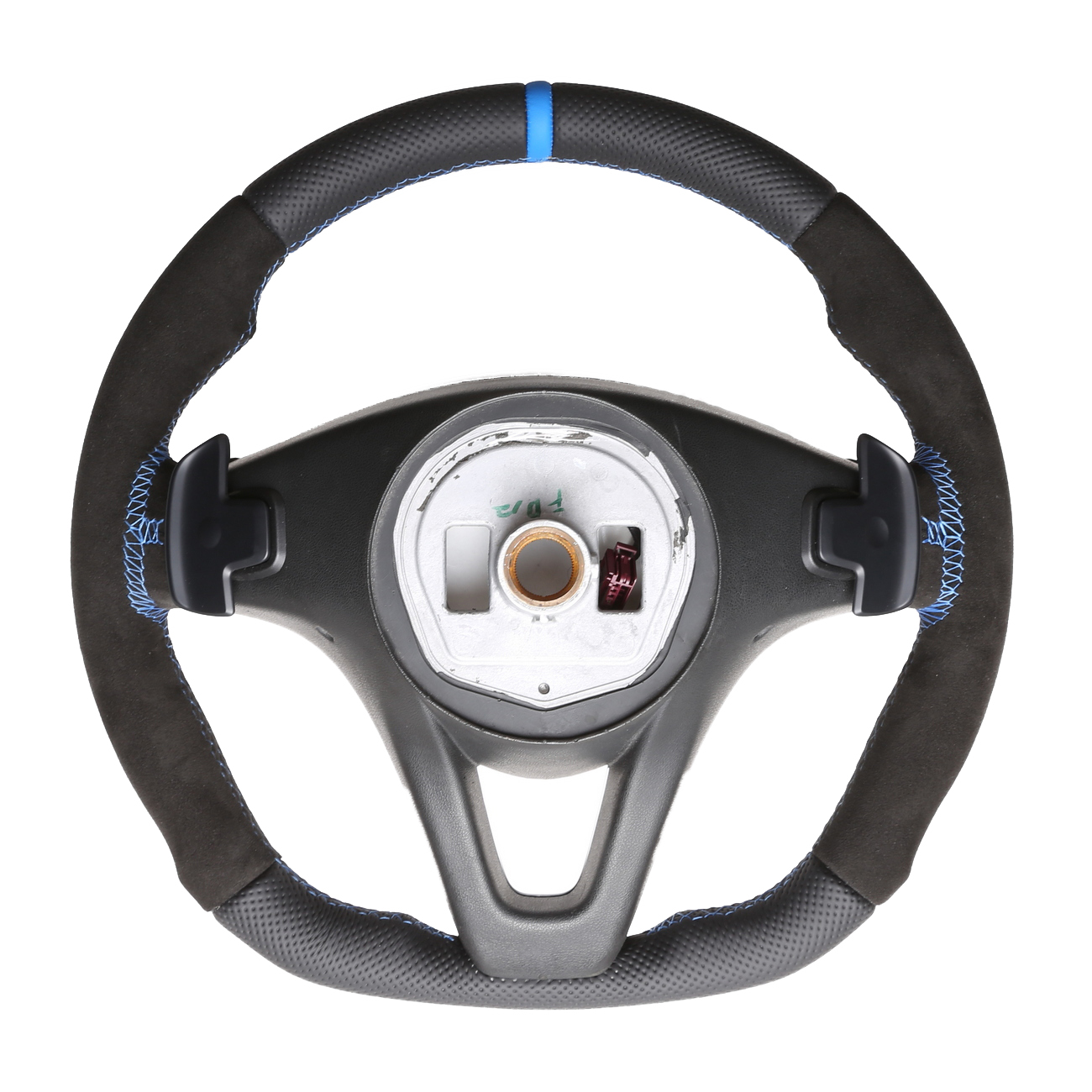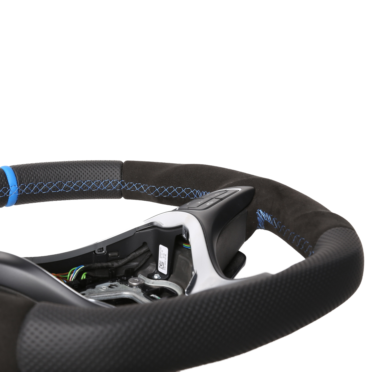 Originalfarbe schwarz, ein Kombibezug aus Alcantara und perforiertem Leder, 12 Uhr Markierung hellblau, Naht hellblau