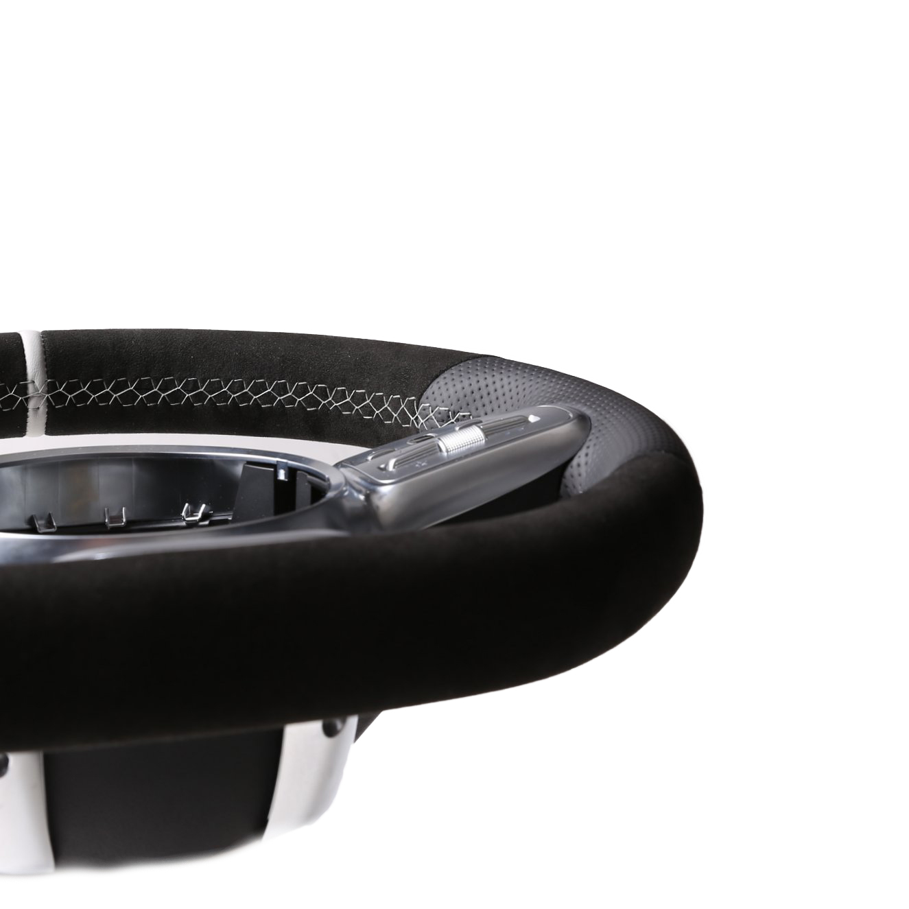 Originalfarbe schwarz, ein Kombibezug aus Mercedes Nappa und Alcantara Leder, 12 Uhr Markierung silber, Naht silber