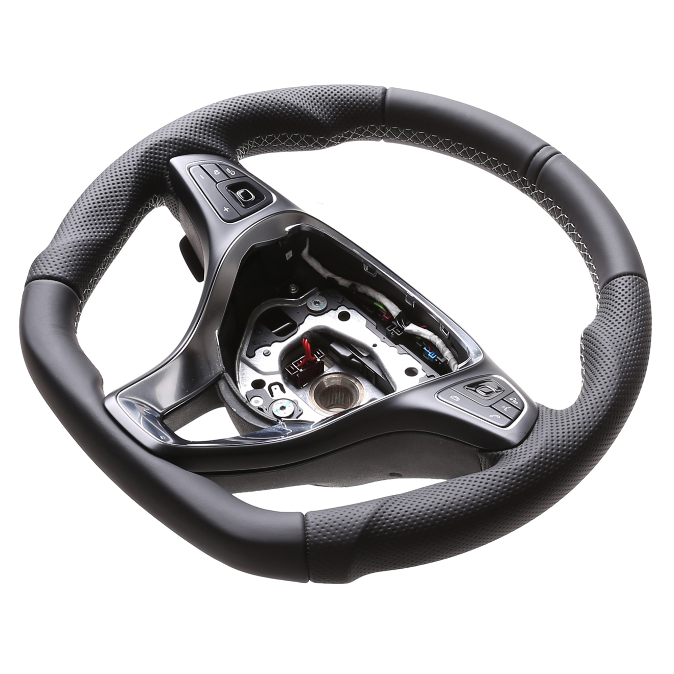 Originalfarbe schwarz, ein Kombibezug aus Mercedes Nappa und perforiertem Leder, 12 Uhr Markierung schwarz, Naht silber