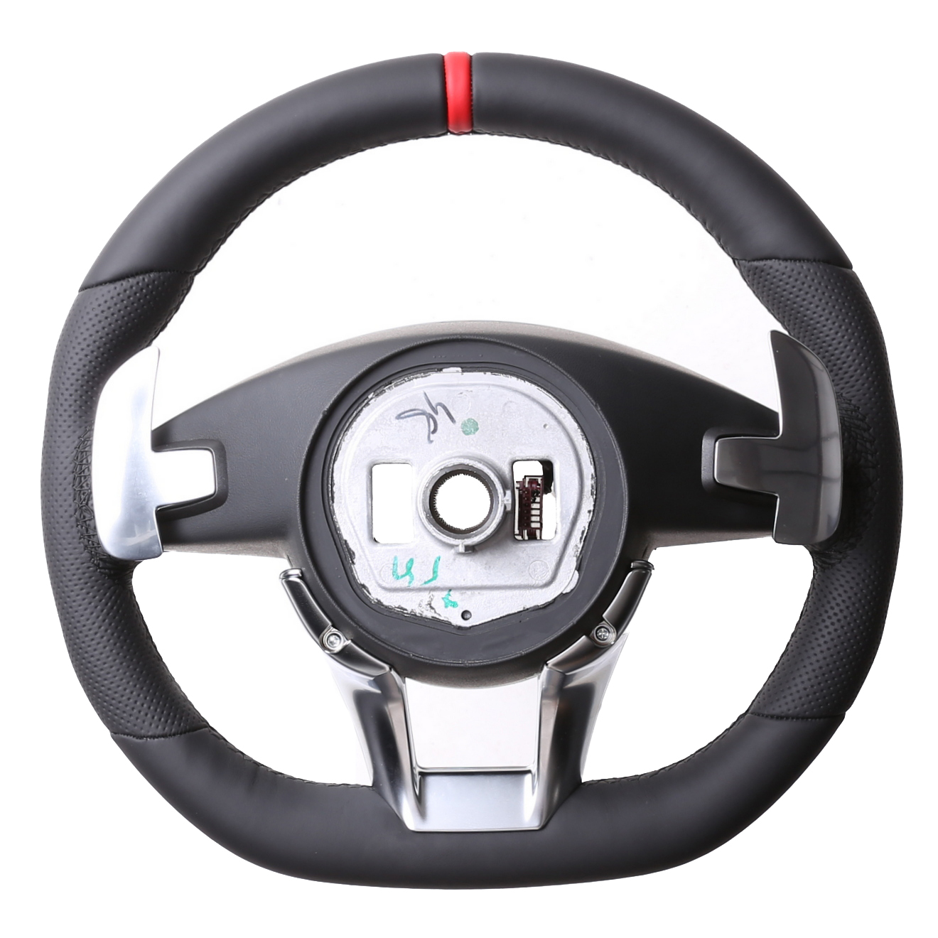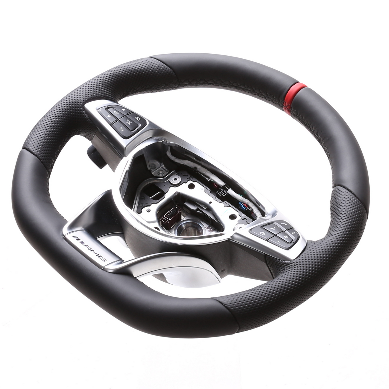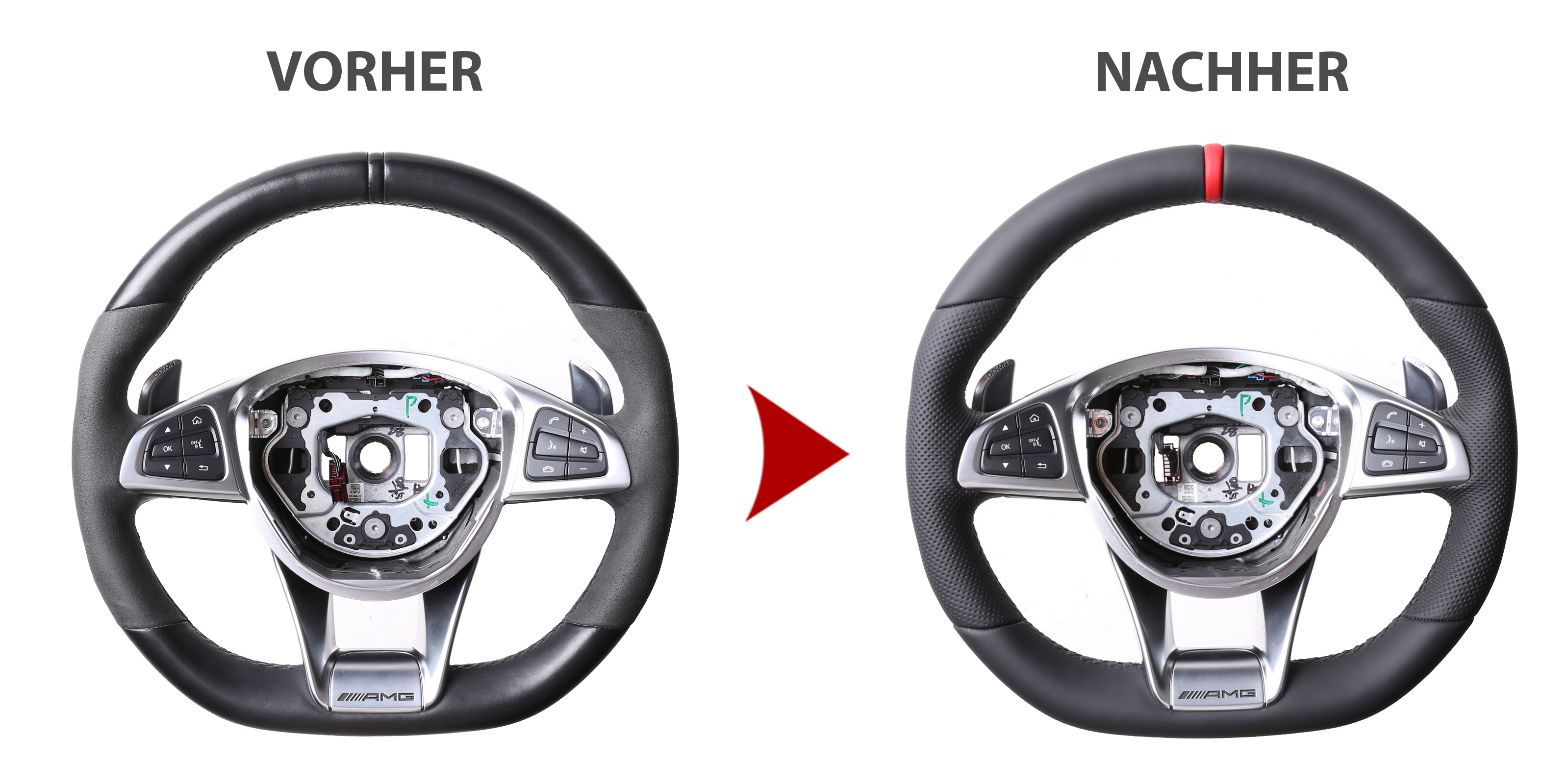 Originalfarbe schwarz, ein Kombibezug aus Mercedes Nappa und Alcantara Leder, 12 Uhr Markierung rot ,Naht schwarz