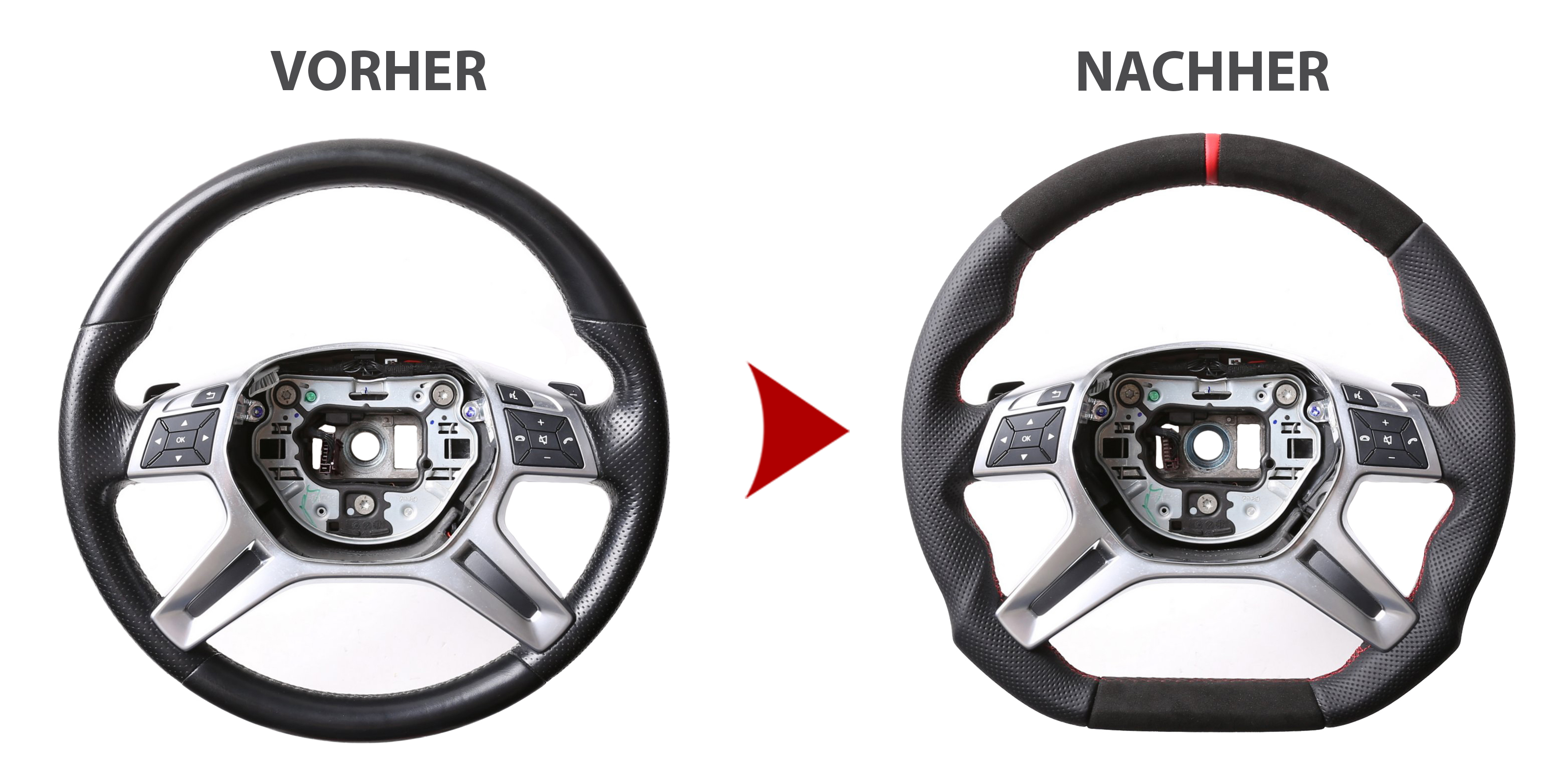 Originalfarbe schwarz, ein Kombibezug aus Mercedes Nappa und Alcantara Leder, 12 Uhr Markierung rot, Naht rot
