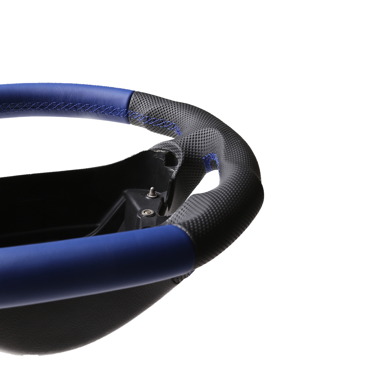 Originalfarbe schwarz/blau, ein Bicolorbezug aus Mercedes Nappa und perforiertem Leder, Naht blau.