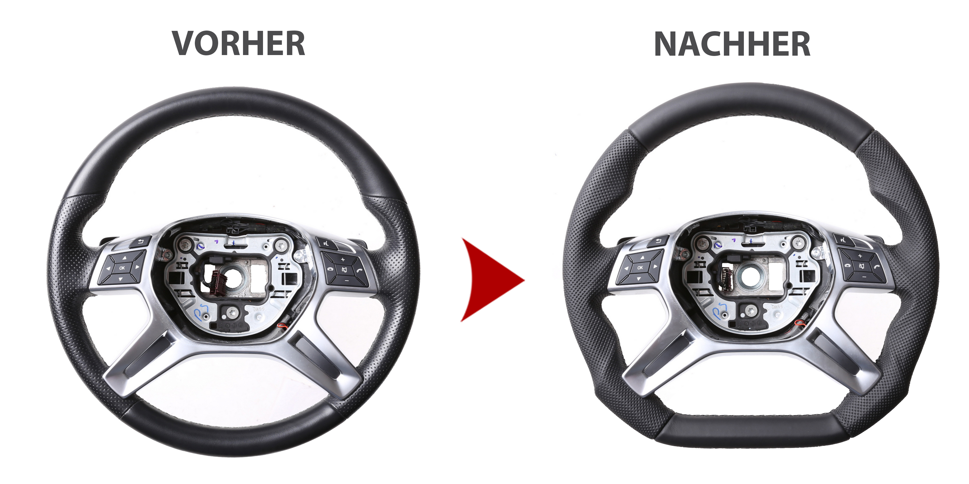 Ob Sie einen einfachen Neu Bezug des Lenkradmodells wünschen oder das Tuning Design oder aber ein abgeflachtes Design, der Preis ist bei allen Varianten gleich. Der Grund: das hohe Alter der Fahrzeuge und dessen Lenkräder. Diese sind sehr abgegriffen und weisen zum größten Teils starke Defekte am Lenkradkranz auf. Dies bedeutet für uns, den gleichen Arbeits,- und Materialaufwand für alles Designs.