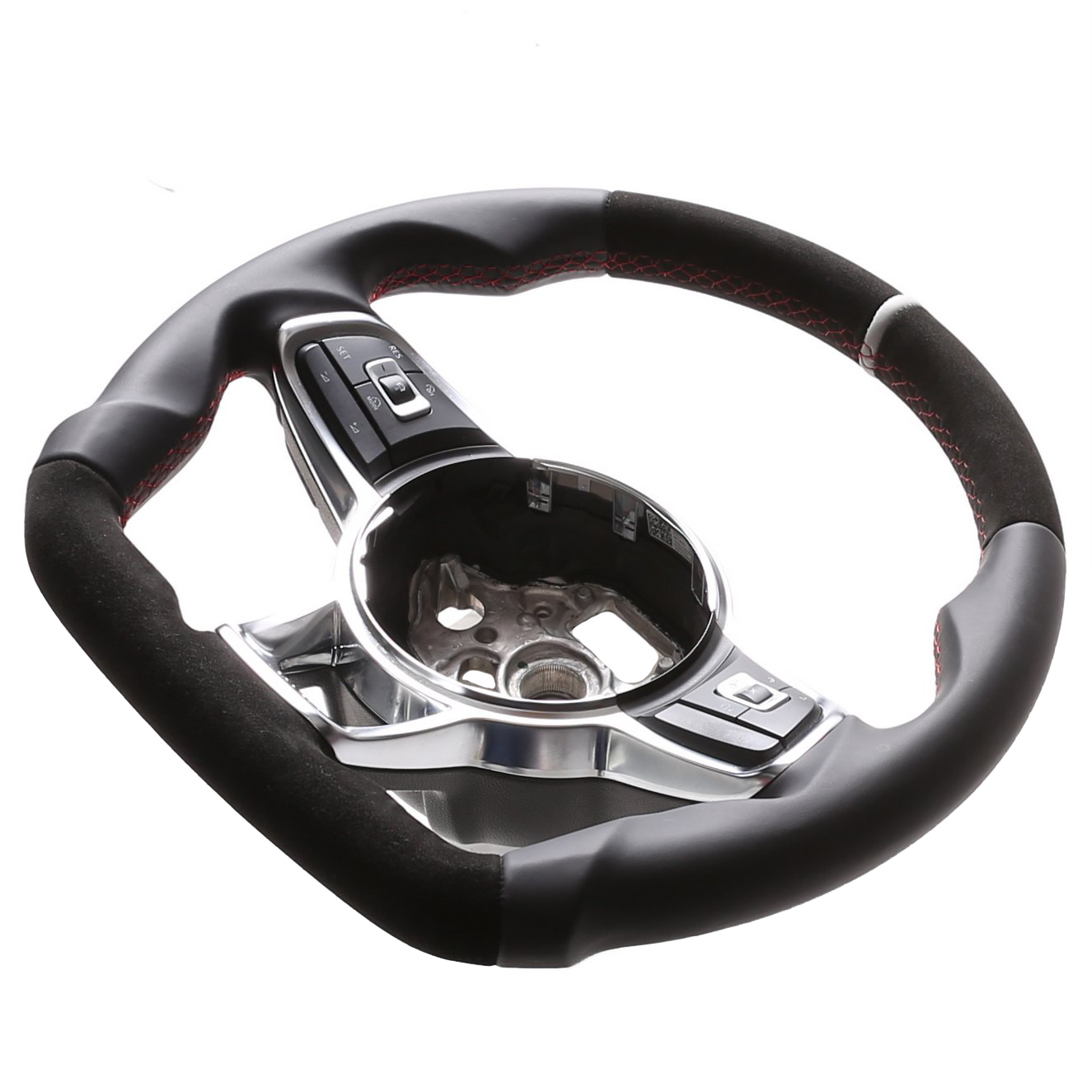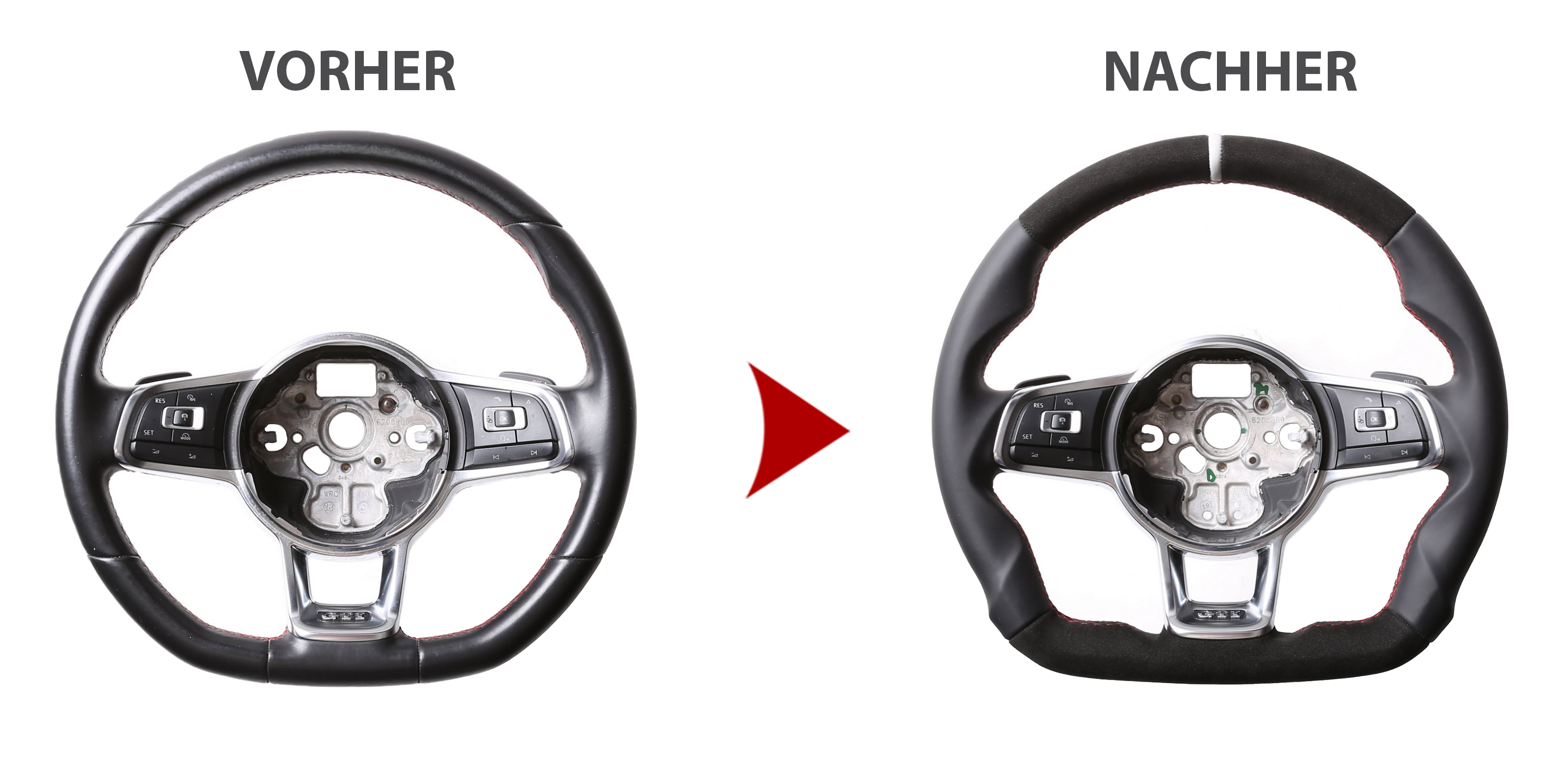 Originalfarbe schwarz, ein Kombibezug aus VW Nappa und Alcantara Leder, 12 Uhr Markierung silber, Naht rot