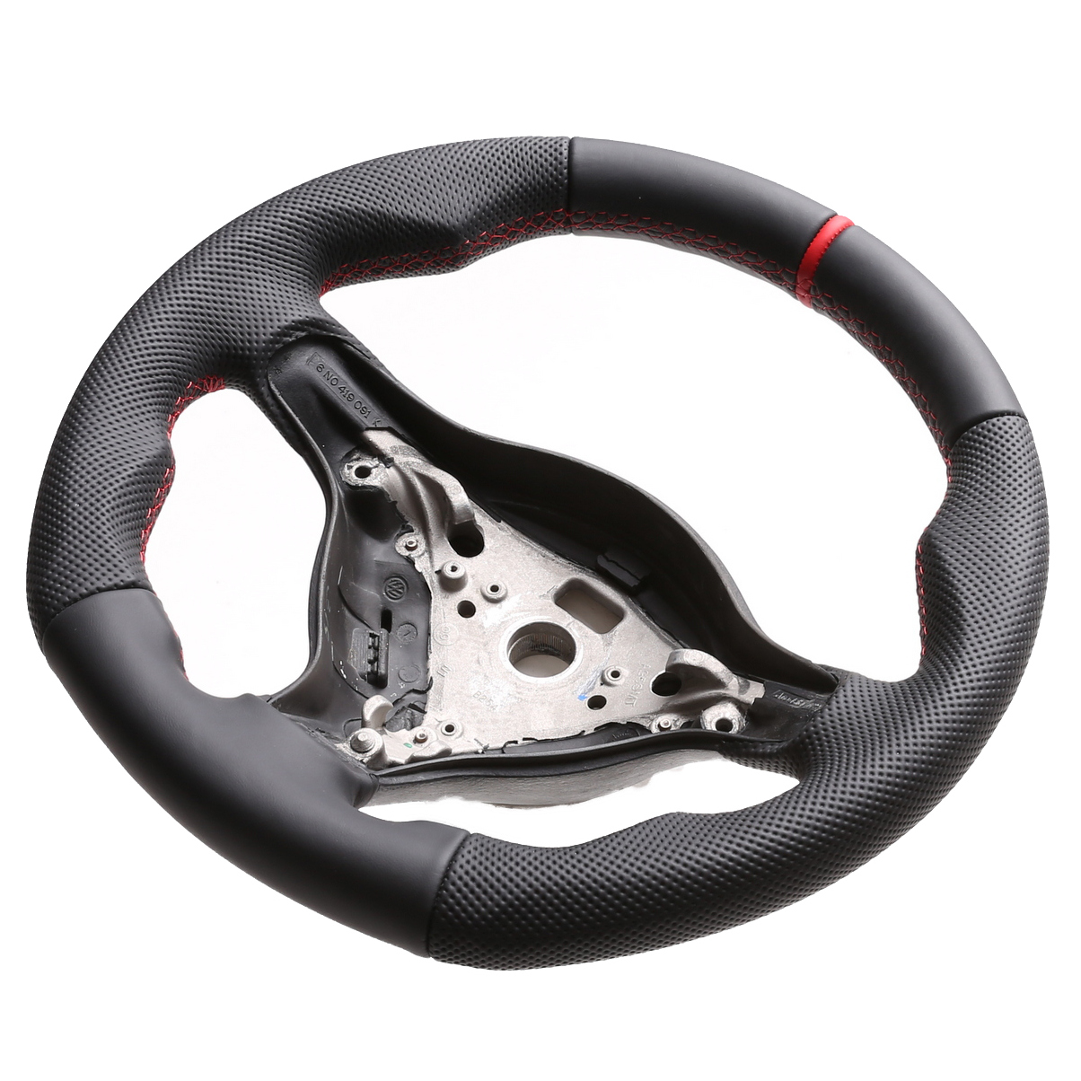 Originalfarbe schwarz, Kombibezug aus VW Nappa und perforiertem Leder, 12Uhr Markierung rot, Naht rot